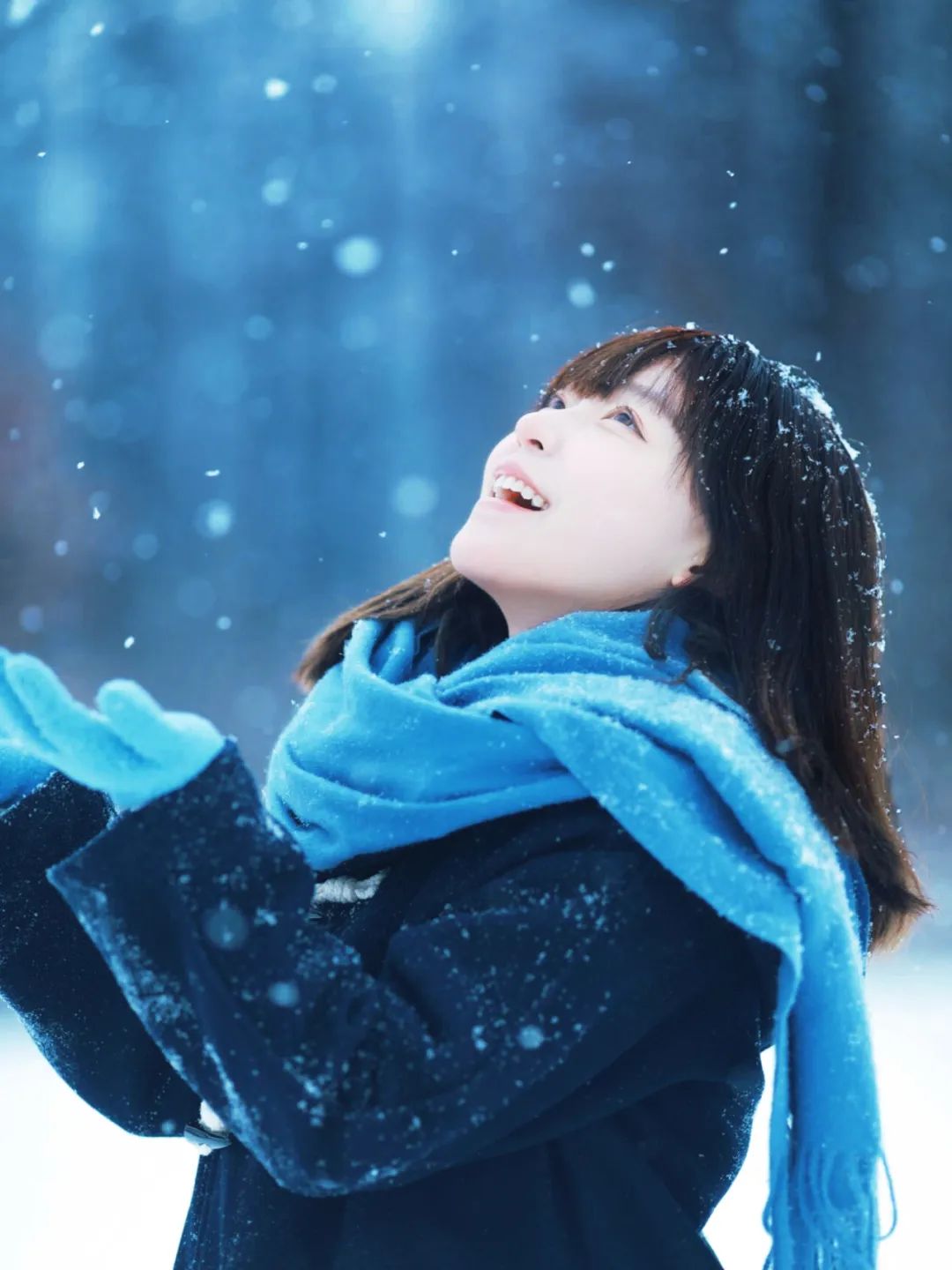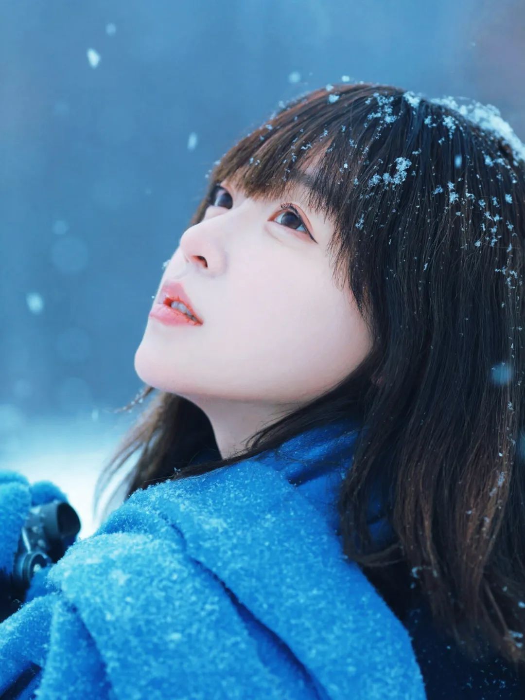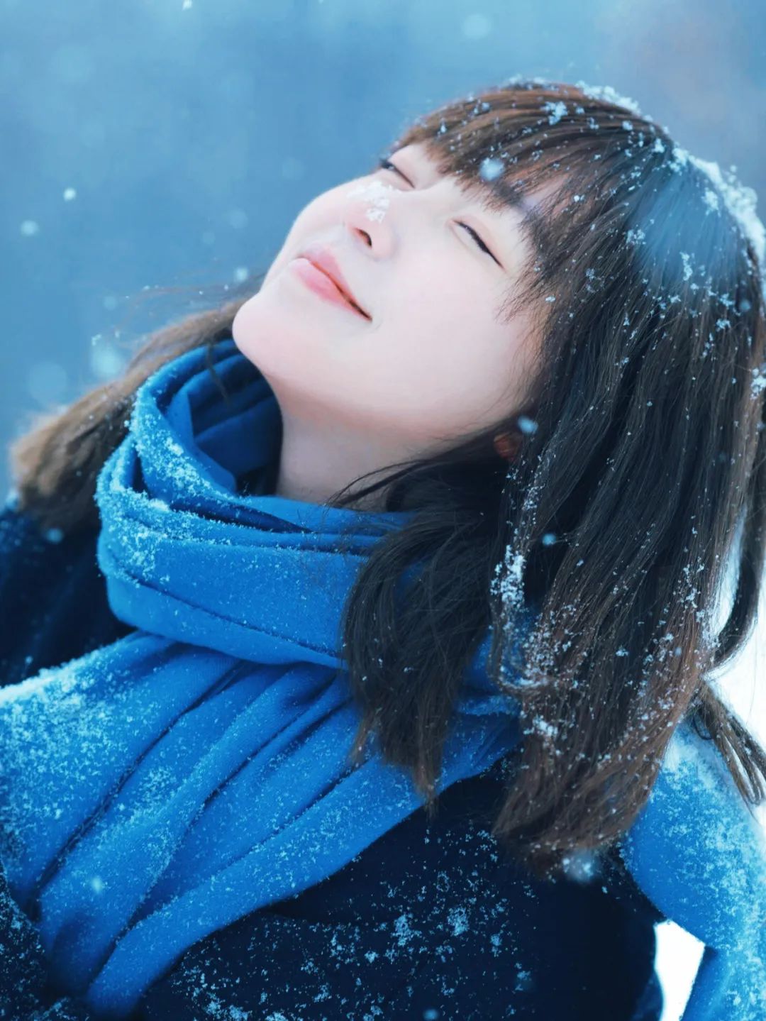 这个姿势传递出对雪花轻柔触感的享受和对冬日氛围的沉醉。闭眼的动作增加了一种冥想般的深度,仿佛在倾听雪的声音或是感受雪的纯净。抬头的姿态则展现了对自然的敬畏和对宁静时刻的珍惜。这个姿势的特写镜头强调了面部表情的细微变化,从轻轻上扬的嘴角到微皱的眉头,都可能讲述着一个关于冬日的故事。