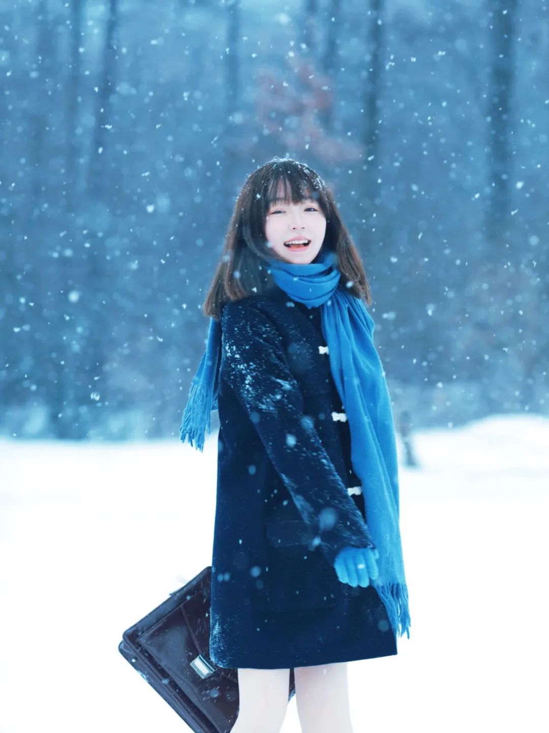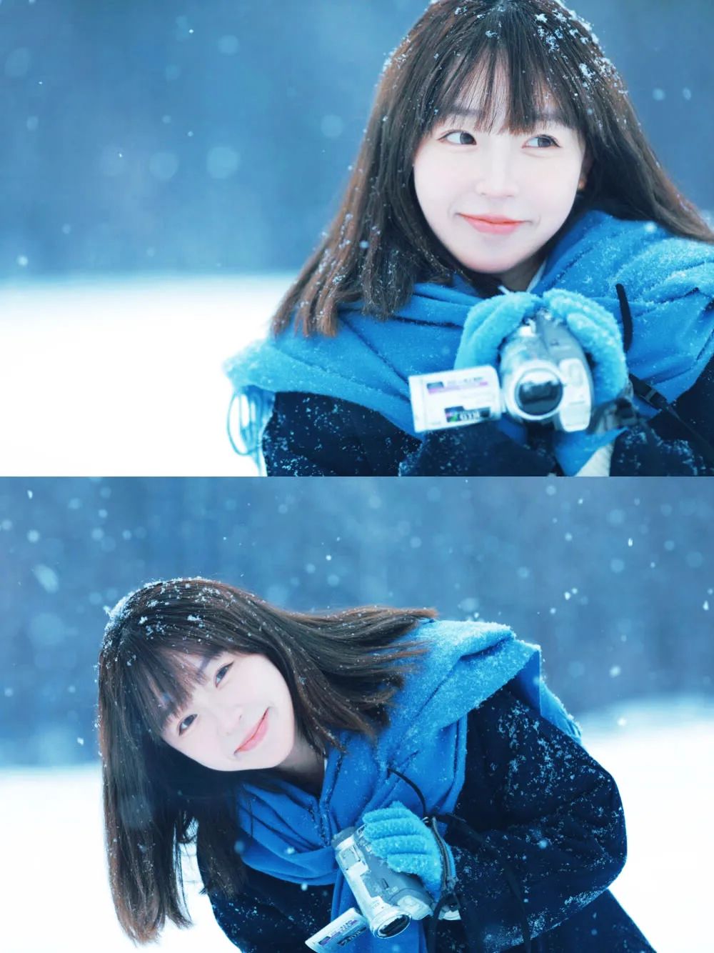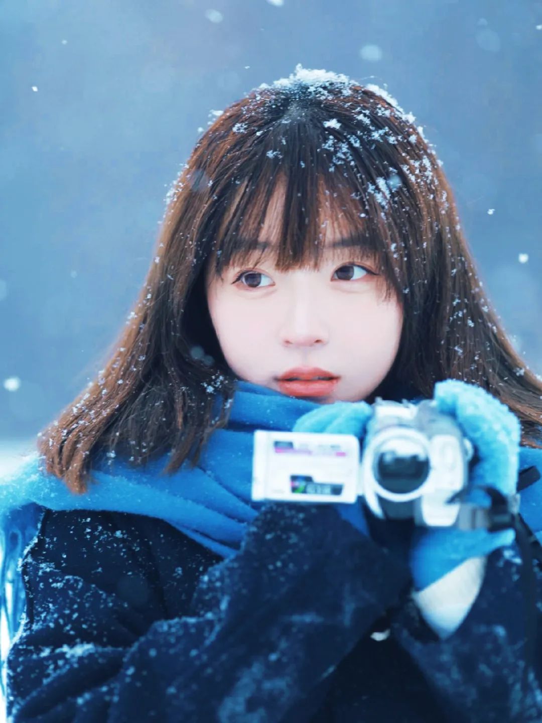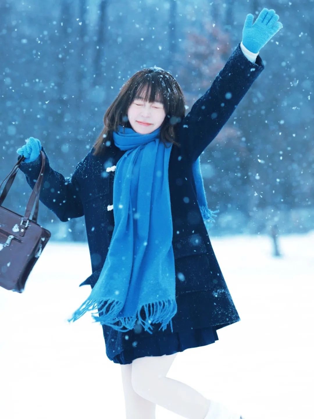 这个姿势传递出对雪花轻柔触感的享受和对冬日氛围的沉醉。闭眼的动作增加了一种冥想般的深度,仿佛在倾听雪的声音或是感受雪的纯净。抬头的姿态则展现了对自然的敬畏和对宁静时刻的珍惜。这个姿势的特写镜头强调了面部表情的细微变化,从轻轻上扬的嘴角到微皱的眉头,都可能讲述着一个关于冬日的故事。