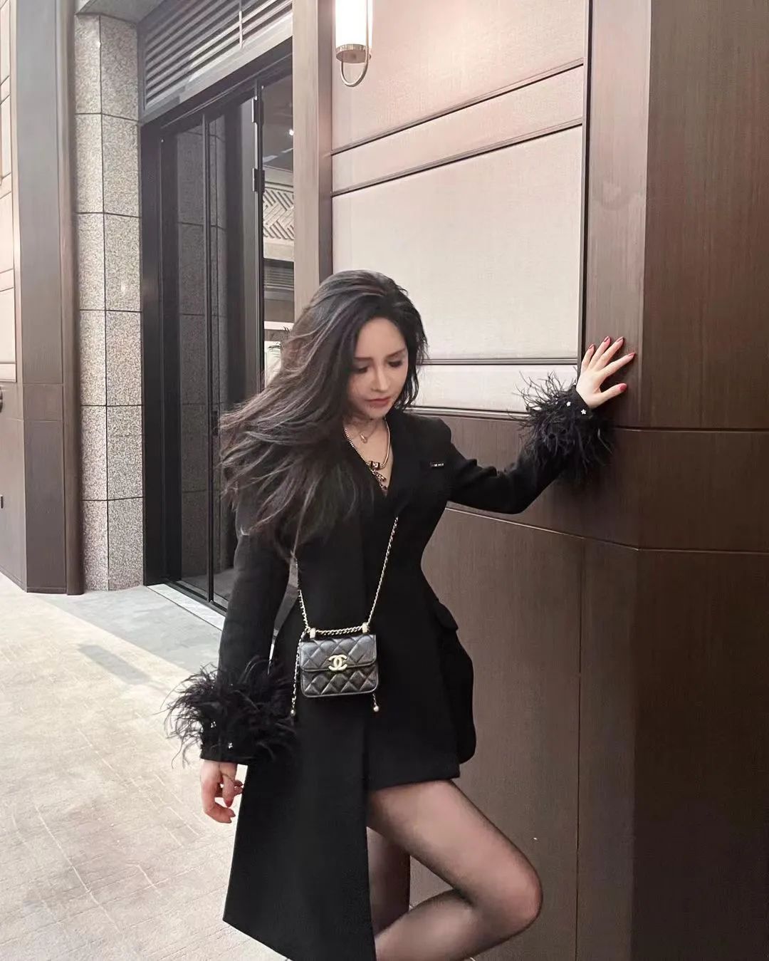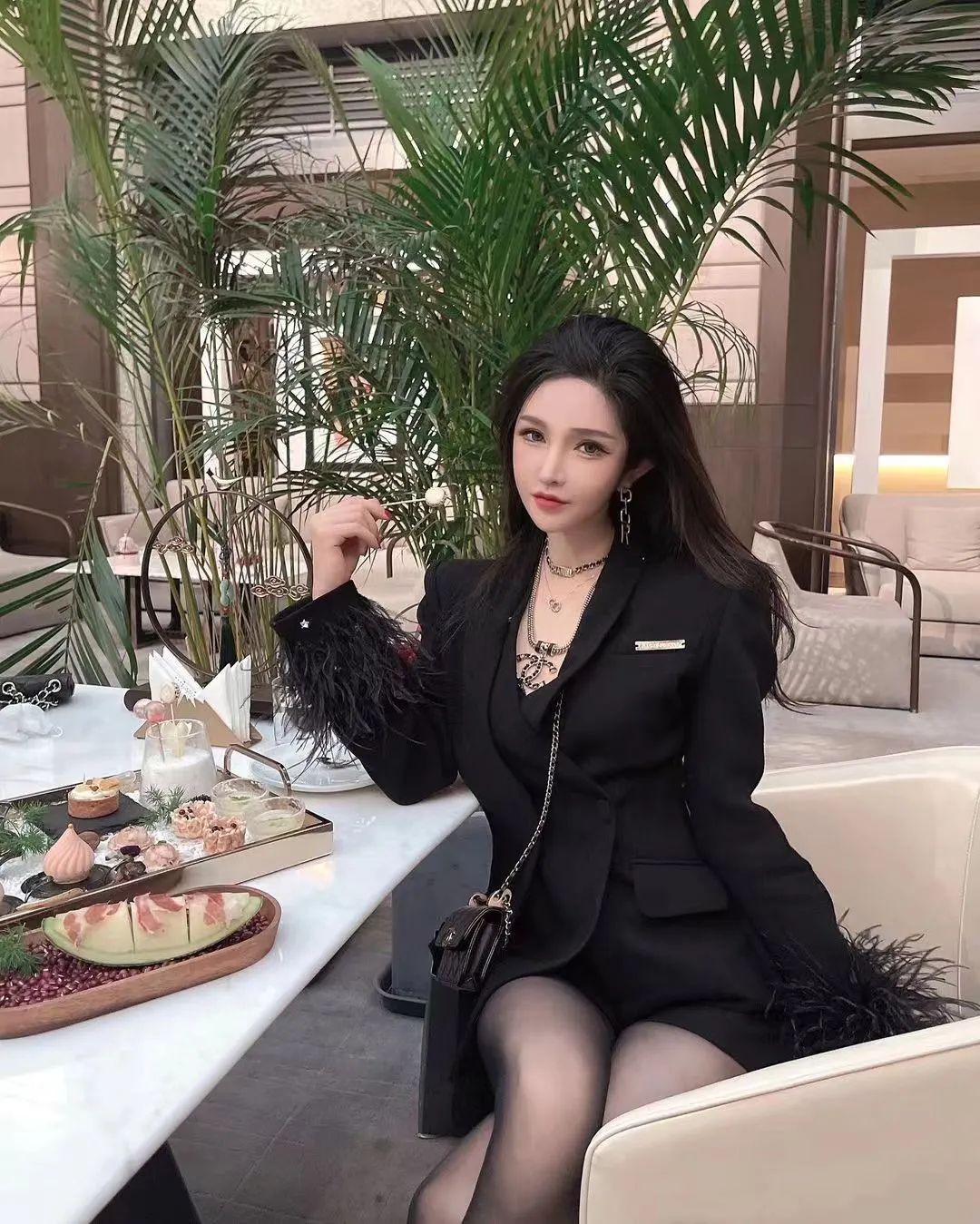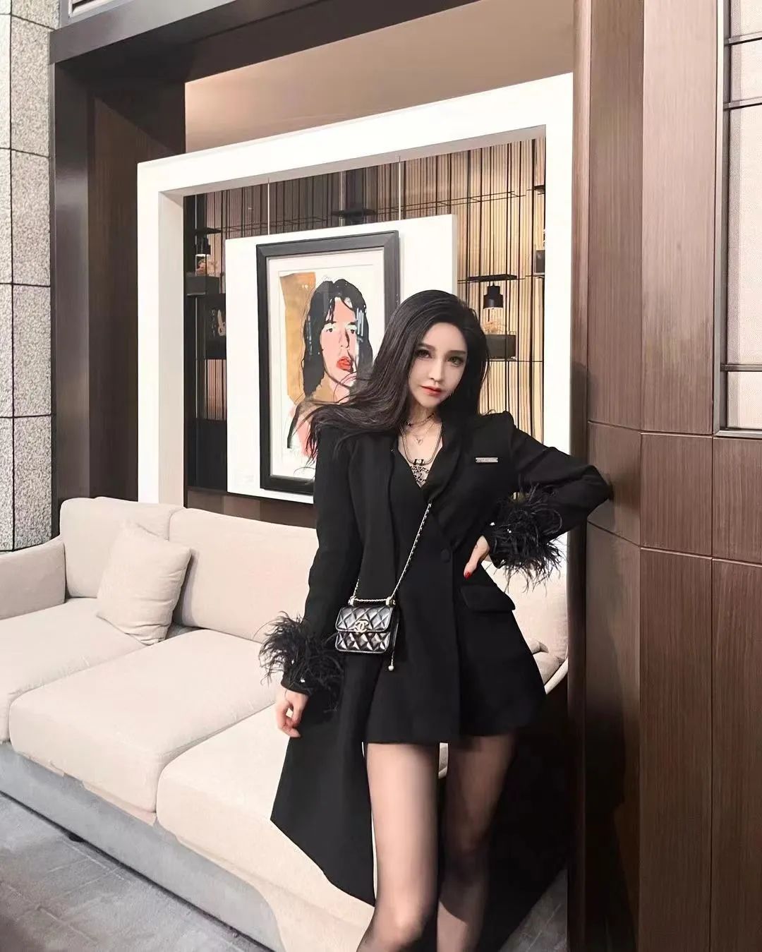 网红模特Saya的这组写真尽显优雅时尚。她身着黑色西装外套搭配紧身裤,经典又不失干练。脚下的黑色高跟鞋更是点睛之笔,拉长腿部线条,尽显女性魅力。米色沙发上的抱枕与白色茶几上的装饰品,为整体穿搭增添了一抹温馨与雅致。Saya的妆容精致,表情自然,与背景中的人物肖像画作相得益彰,仿佛画中走出的时尚达人,让人不禁为她的穿搭品味点赞。