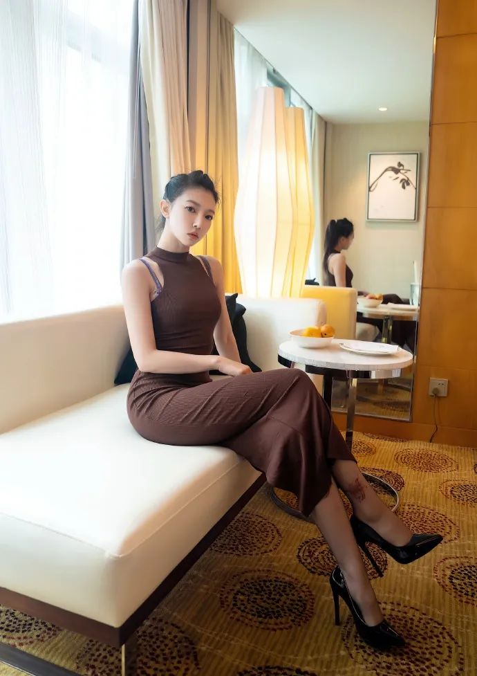 冯木木的这组写真展现了现代与优雅的完美结合。她身着一件棕色紧身连衣裙,勾勒出曼妙的身姿,搭配黑色高跟鞋和长筒袜,更添一份性感与魅力。披肩的秀发自然垂落,与精致的妆容相得益彰。白色沙发和木质桌子的背景,以及桌上的书籍和橙色水果,都凸显了她的品味。冯木木的穿搭简约而不失格调,让人眼前一亮。