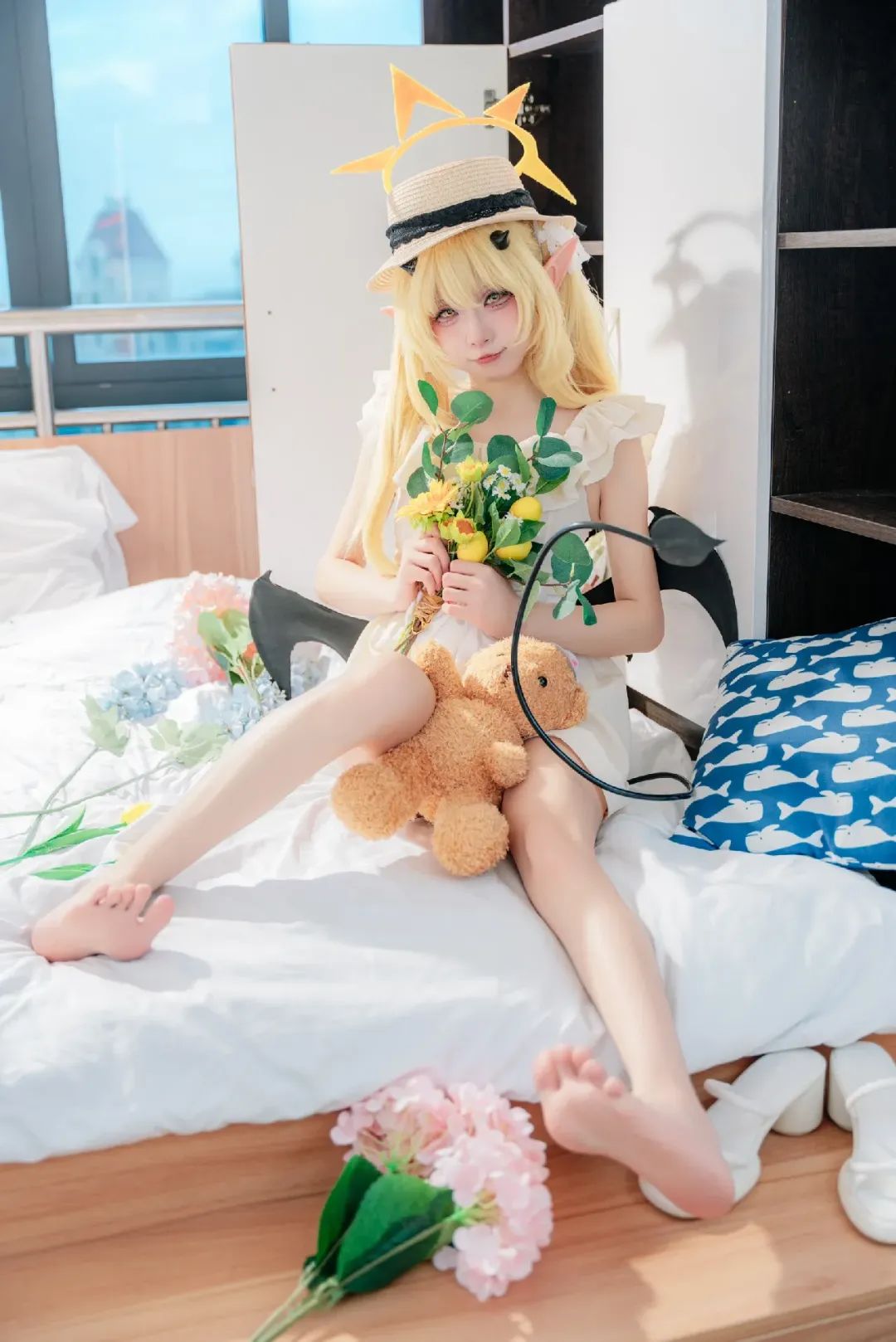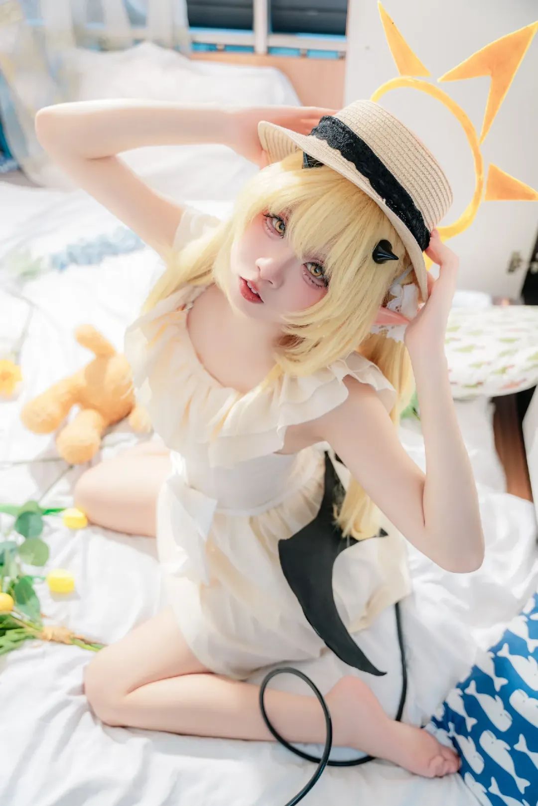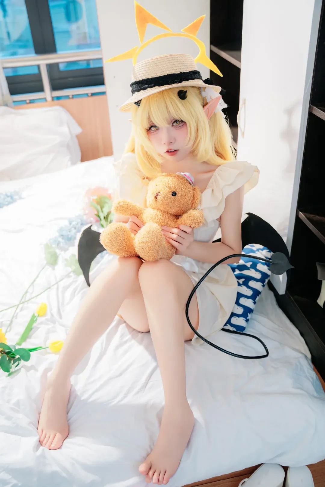 ? 我的头上戴着一副精致的黑色小恶魔角,它们俏皮地翘起,为我的整体造型增添了一抹趣味性和个性感。这个小细节让我看起来更加生动活泼,仿佛是从童话故事中走出来的小恶魔,既可爱又迷人。