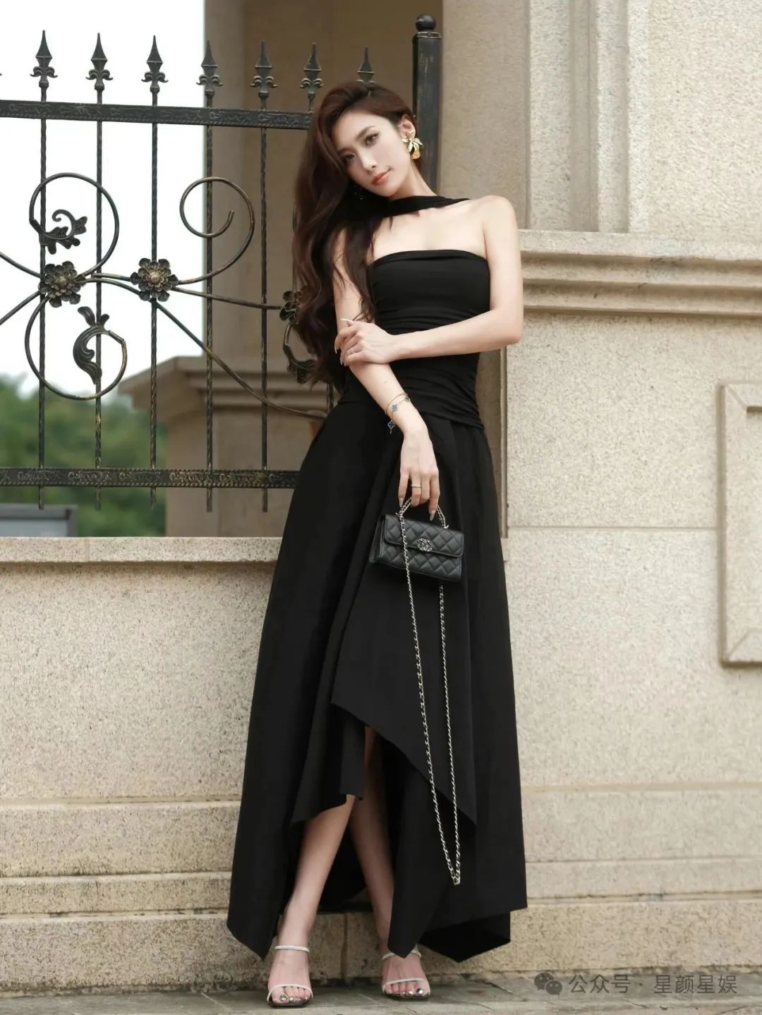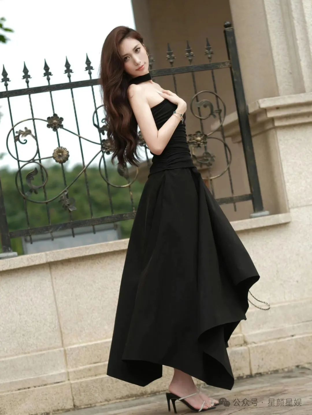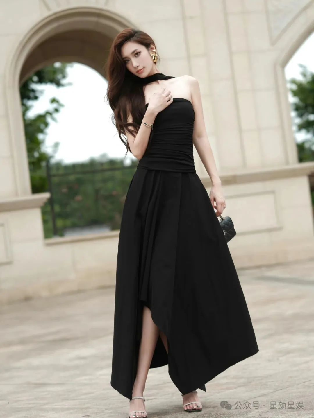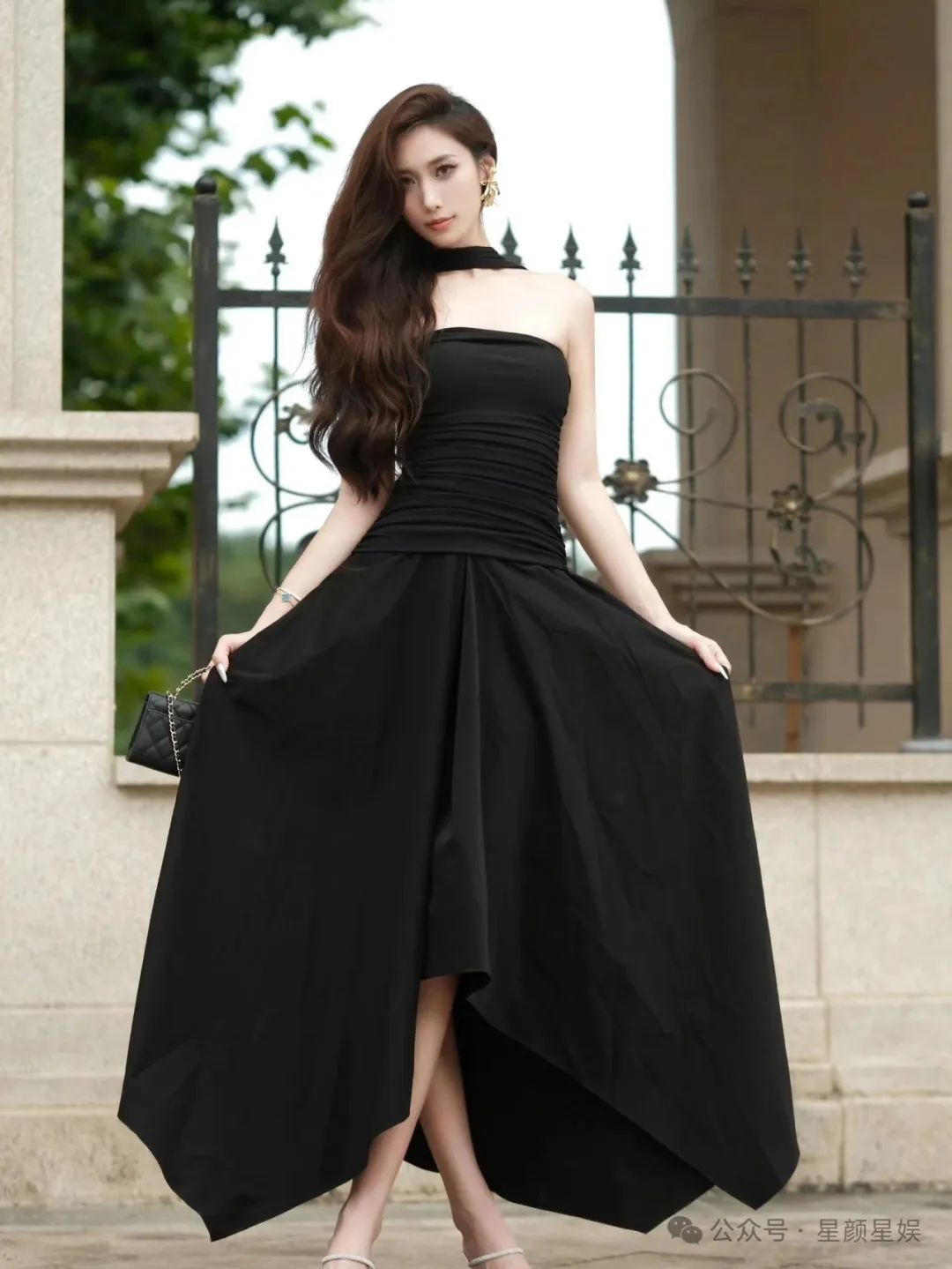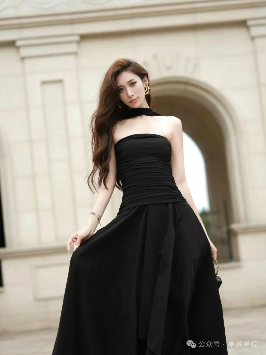 高颜值女神,修长身材,黑色抹胸裙,太迷人