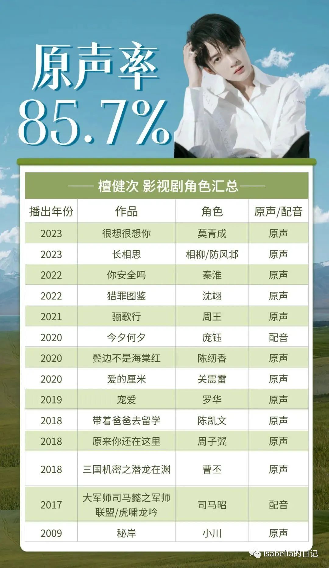 “我会努力争取每一个角色都是原声,只有原声才代表这个角色完全属于自己。”坚定的声音在心中回响,许下的承诺说到做到。14部代表作品中,12部都是原声,原声率高达85.7%。