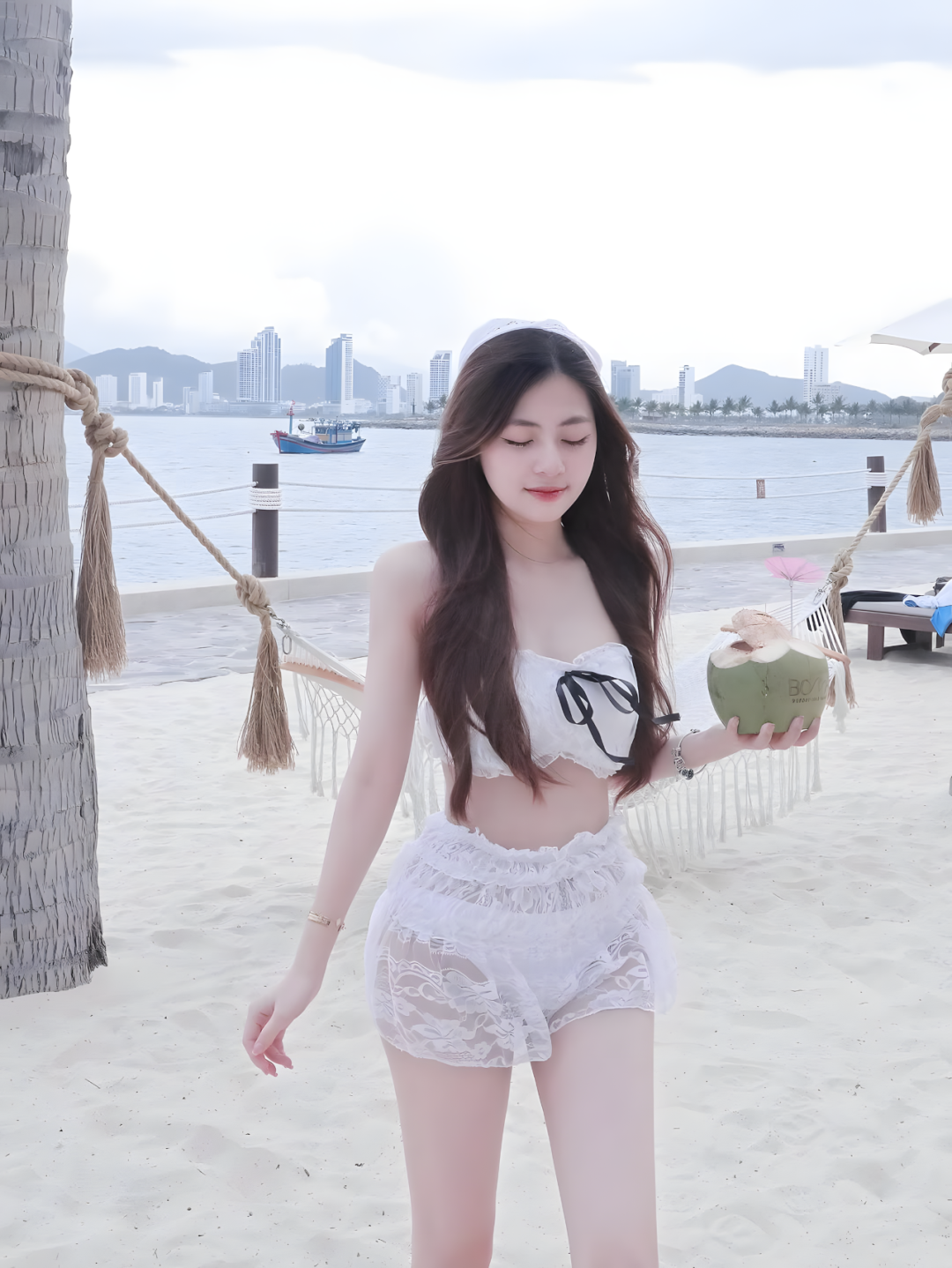我们还可以以建筑特色为背景,让摄影师放大去拍我们的半身照,非常清晰又很干净的看到我们今天的精致妆容,穿这种白色简约的连衣裙,搭配一个白色包,整个氛围非常优雅自信,又很迷人,佩戴一些简约的珍珠耳环来增加整体的氛围感,非常漂亮,又很自然