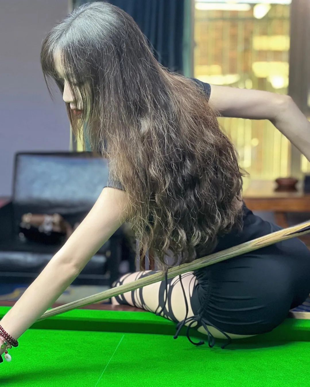 小姐姐是台球房一道靓丽的风景线