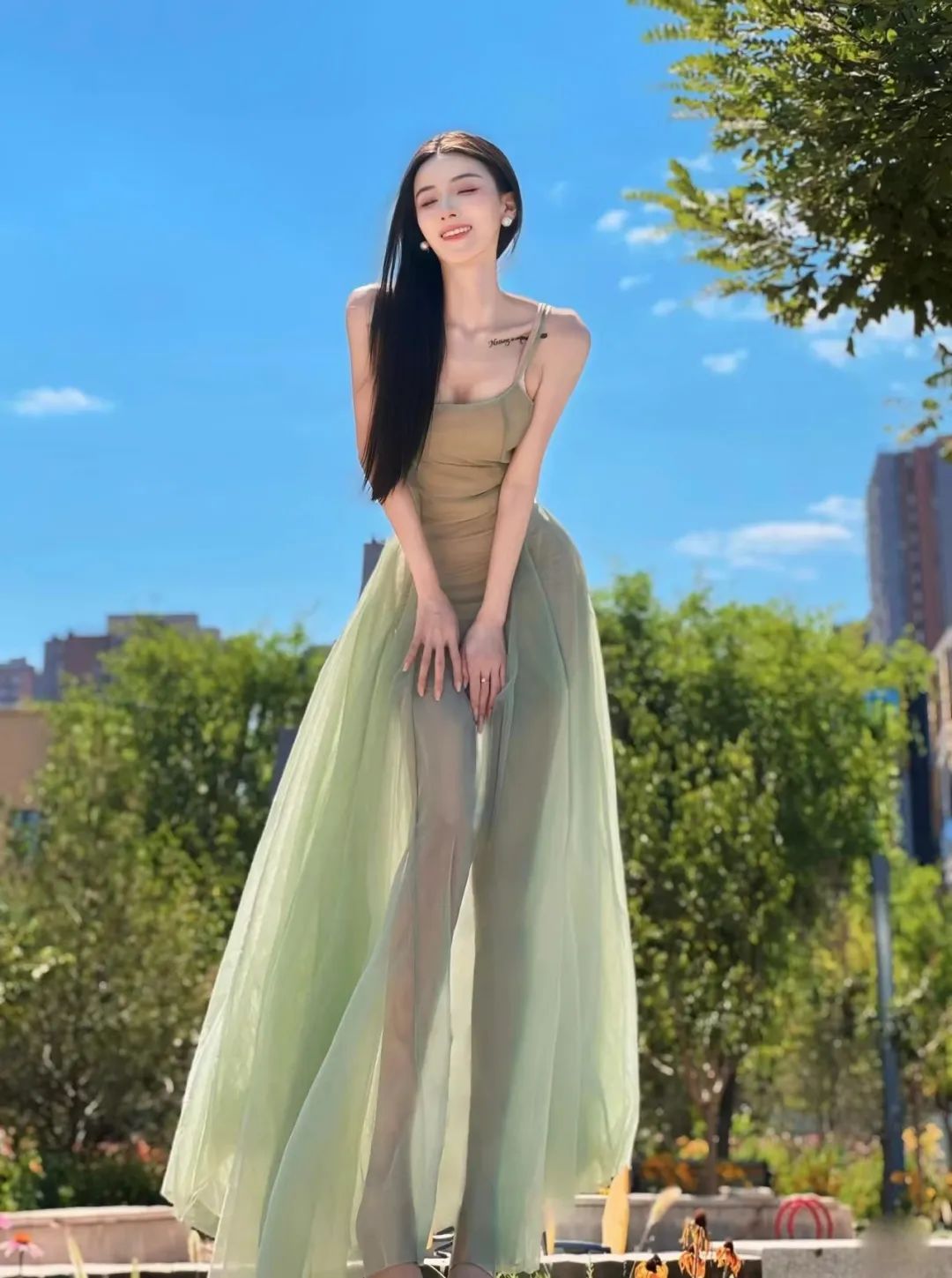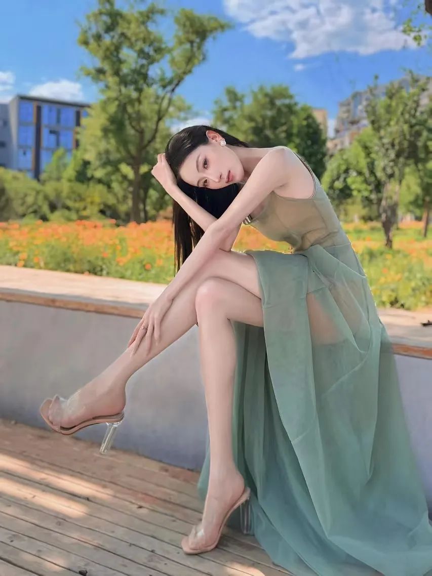 美女身着淡绿连衣裙堪称绝美。薄纱材质半透似梦,将优雅与性感完美融合。它巧妙地勾勒出纤细的腰肢和修长的腿部线条,宛如艺术画卷。