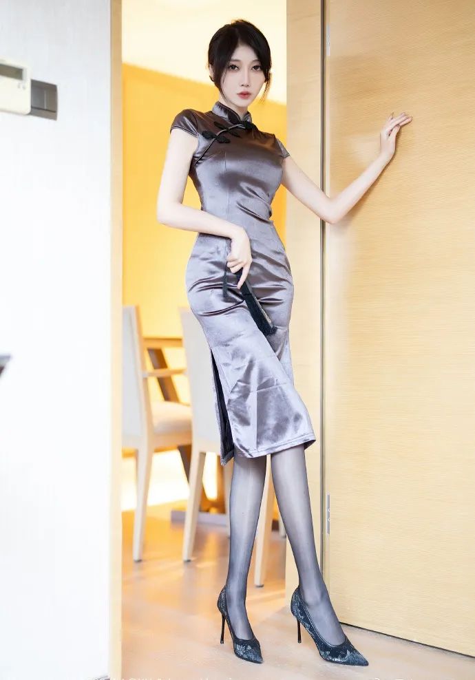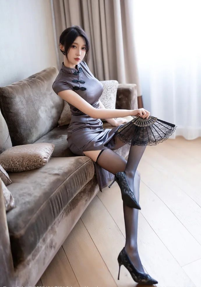 网红模特玥儿玥,身着深灰色紧身开叉旗袍,优雅尽显。旗袍的剪裁勾勒出她前凸后翘的曼妙身姿,开叉设计更添几分妩媚。腿上搭配黑色丝袜,更显修长美腿;脚踏黑色高跟鞋,步履间尽显风情万种。手中轻摇一把黑色小折扇,更添东方古典韵味。这组写真中,玥儿玥仿佛从旧时光中走来,举手投足间,尽显东方美人独有的含蓄与柔美。
