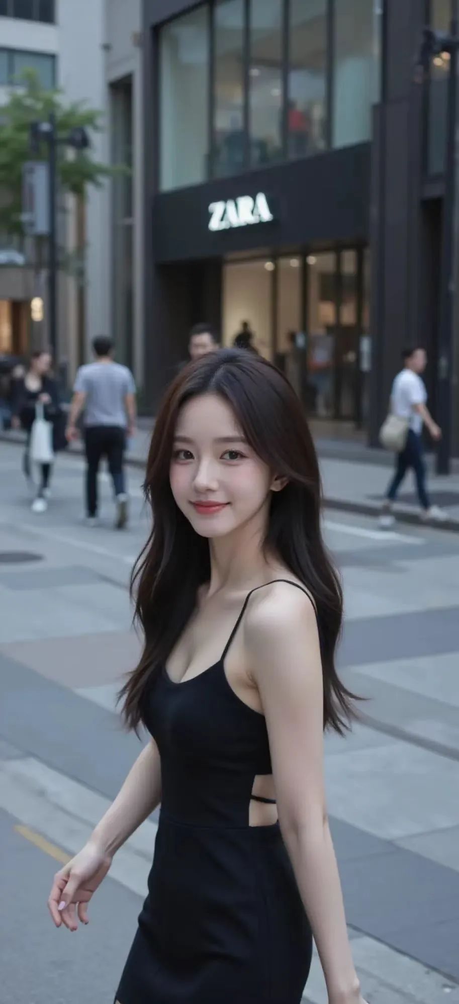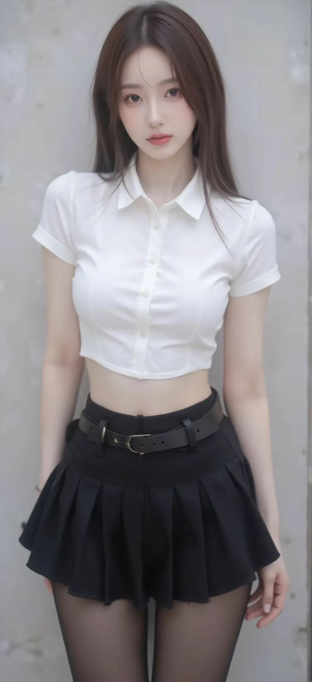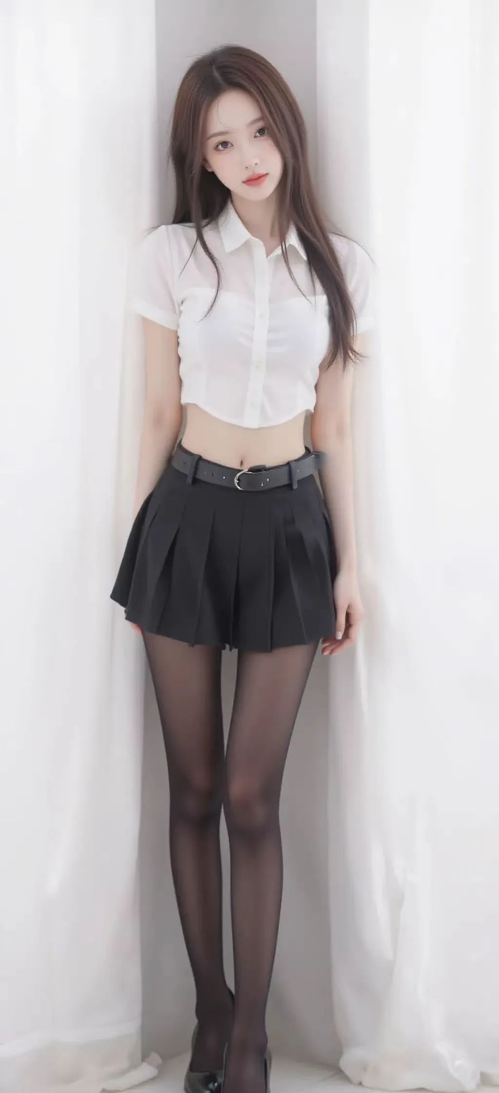 女子身着白色短袖衬衫,领口整齐,搭配黑色百褶裙,腰间黑色皮带增添时尚感,下身穿着黑色丝袜。她有着柔顺的长发,面容姣好,肤色白皙,神态宁静而自信,整体造型青春且时尚。