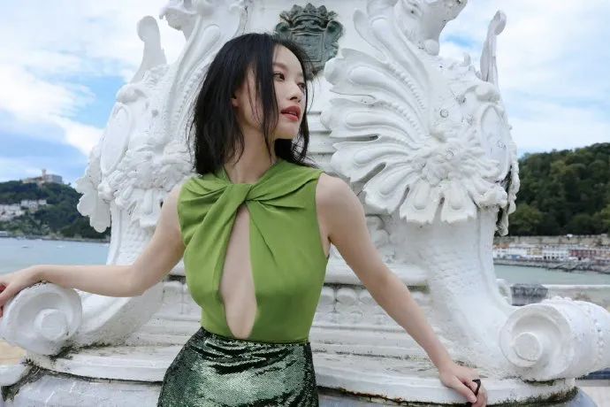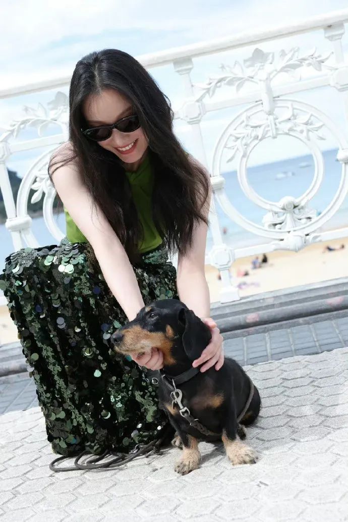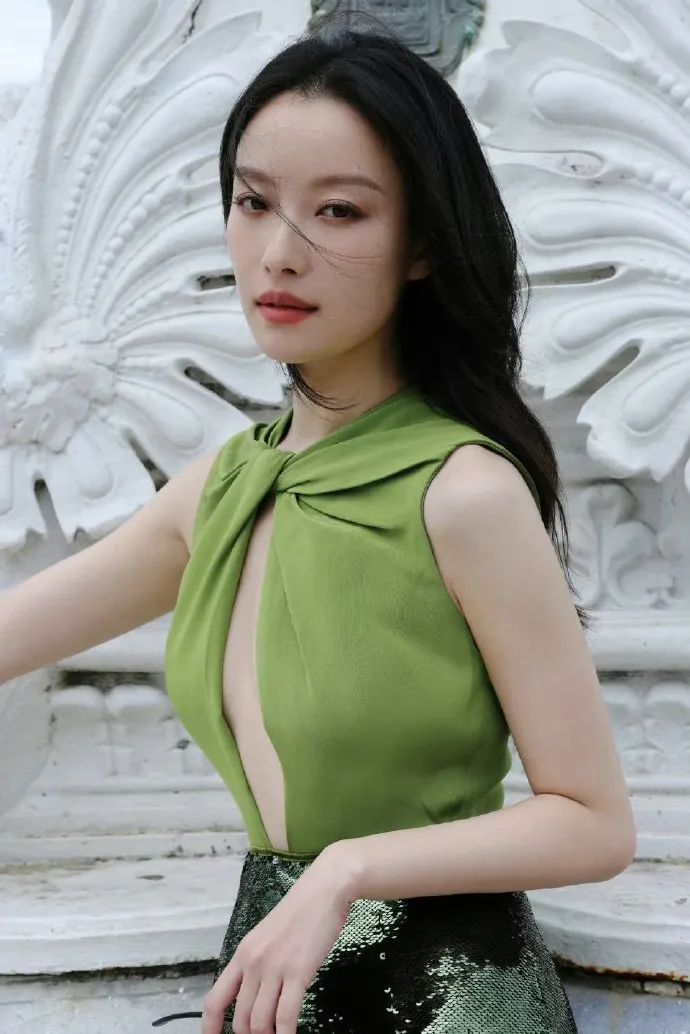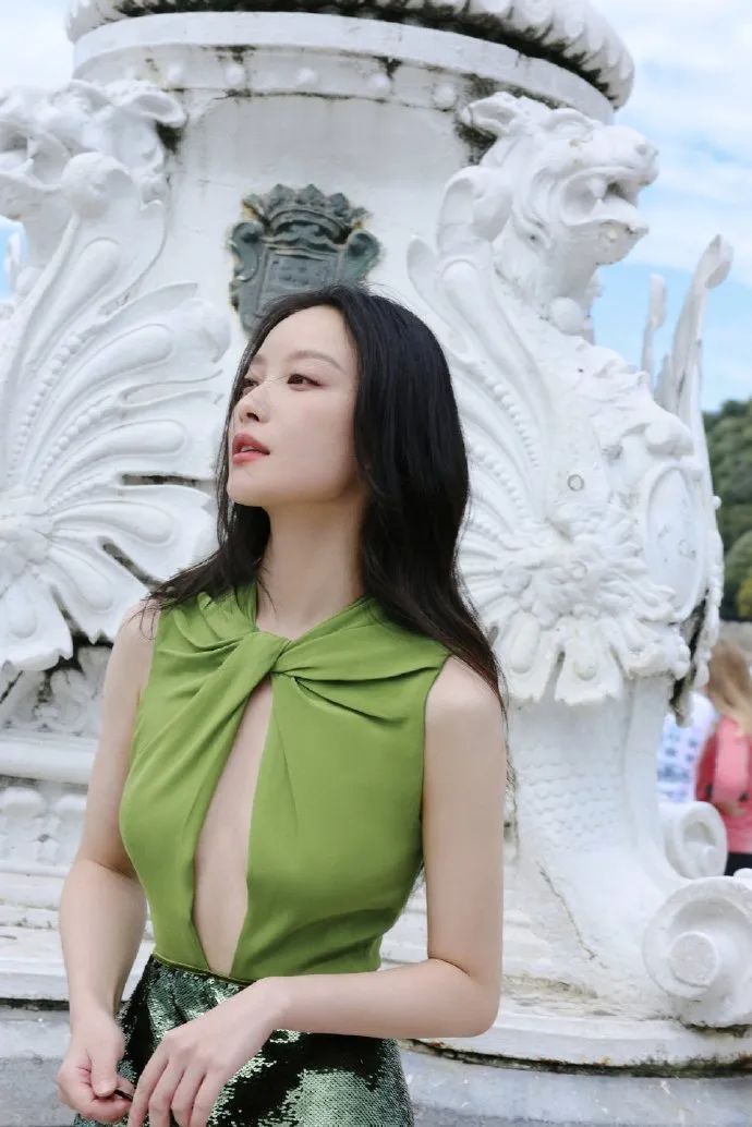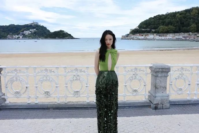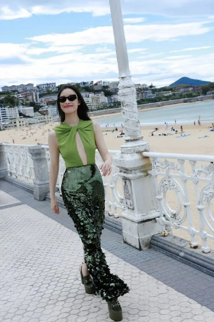 长裙的版型设计流畅自然,裙摆随风轻轻摇曳,既符合海边度假的轻松氛围,又不失女明星应有的高贵气质。而绿色与亮片的结合,更是打破了传统色彩搭配的局限,展现出倪妮独特的时尚审美与不拘一格的穿衣风格。