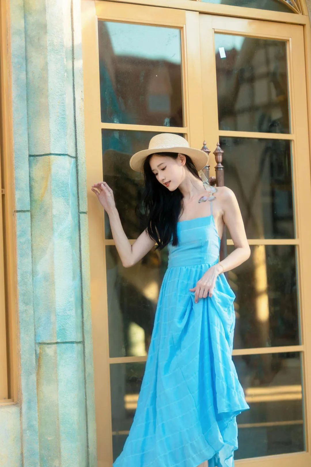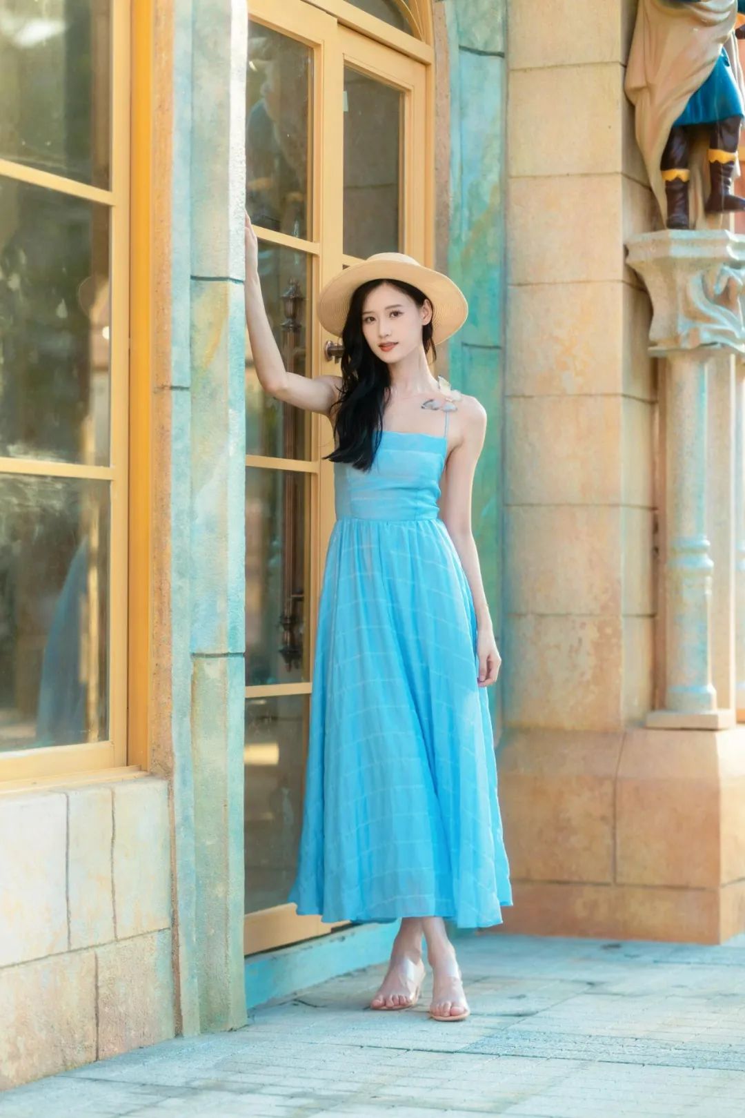 双腿交叉站立,一手扶柱子,简单的动作却能带来优雅气质。这个拍照姿势可以让你显得高挑,还能突出身材曲线。手扶柱子增加稳定感和层次感,为照片增添生动元素。