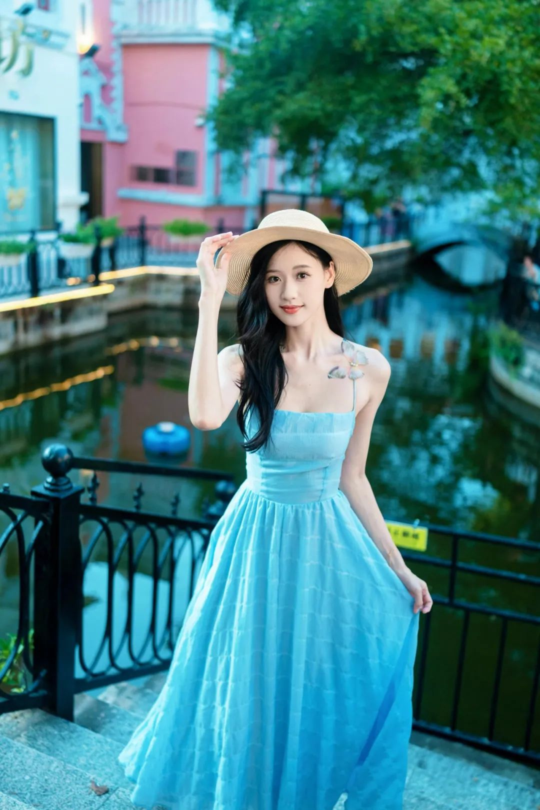 这个拍照姿势能够营造出一种优雅、自然的氛围。摸帽的动作增添了一份俏皮和时尚感,而捏裙则展现了你的女性魅力和温柔。背景的小溪为照片增添了生动和清新的元素,使整个画面更加富有层次感。