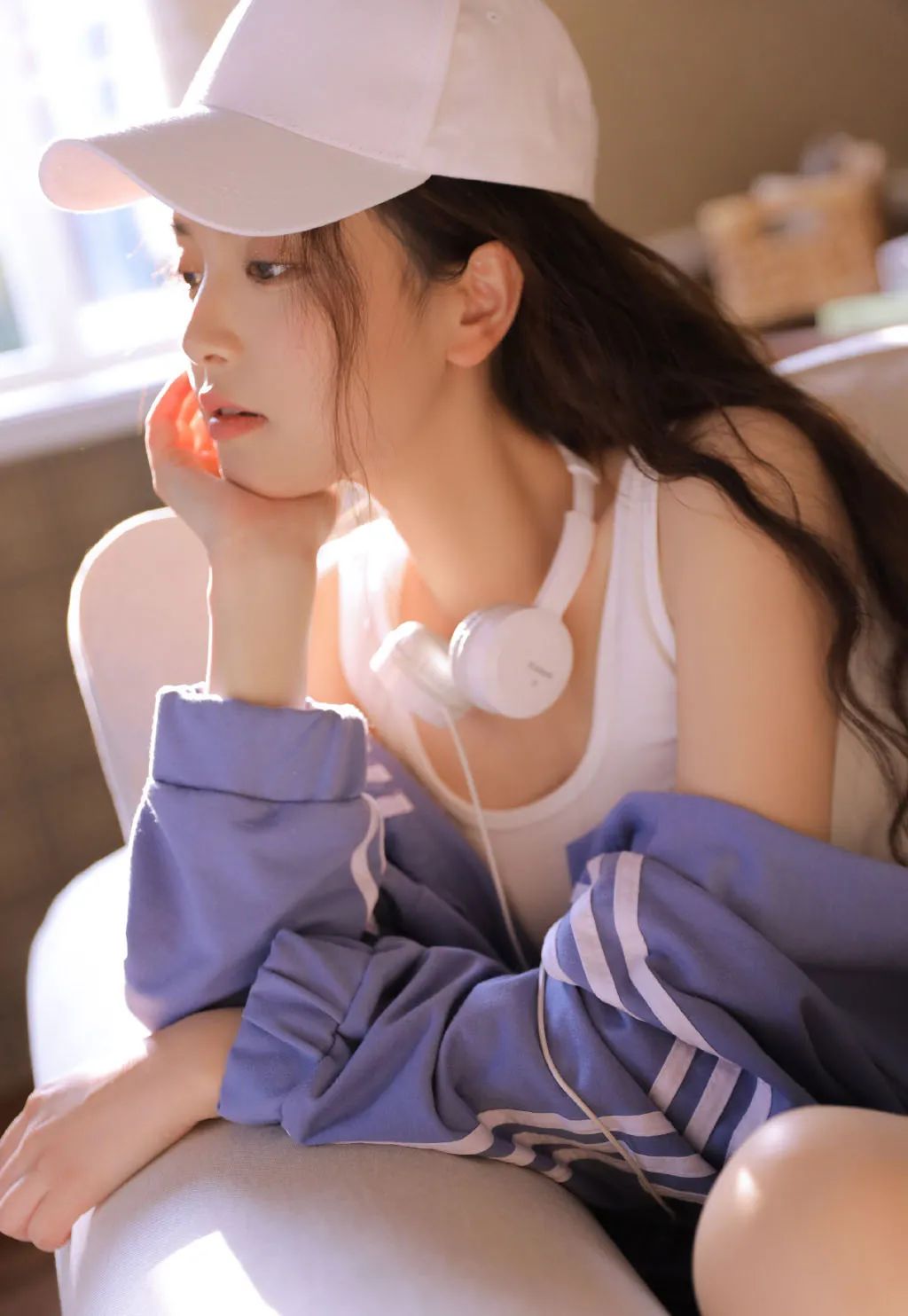 我舒服地躺在客厅的沙发上,身着一件紫色的连帽衫和一条简洁的黑色运动短裤,整个人显得格外有活力。我的头发被高高束起,形成了一个精神的马尾,更添几分朝气。手中随意把玩着一副耳机,似乎在沉思着什么,或是沉浸在自己的世界里。