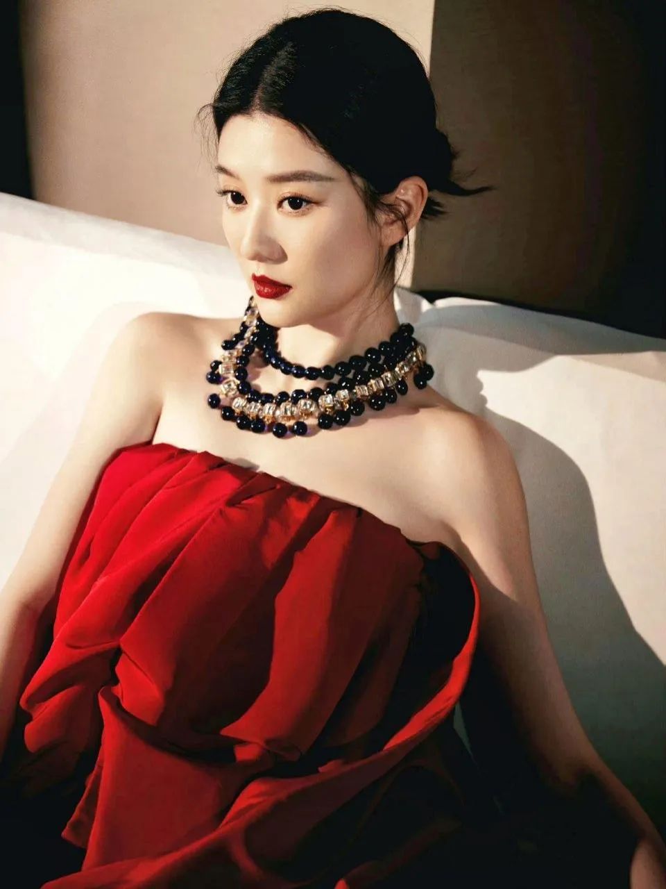配饰方面,乔欣选择了一条简约的黑色项链作为点缀,其经典的设计与红色连衣裙形成了鲜明的对比,既突出了颈部的优美线条,又避免了整体造型过于单调。此外,她脖子上还佩戴着其他精致的装饰品,这些小细节无疑为整体造型增添了几分层次感和时尚感。
