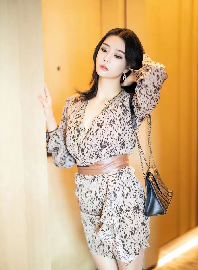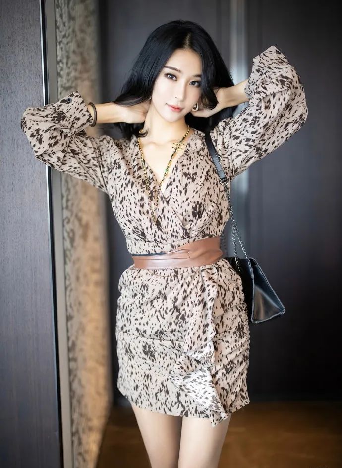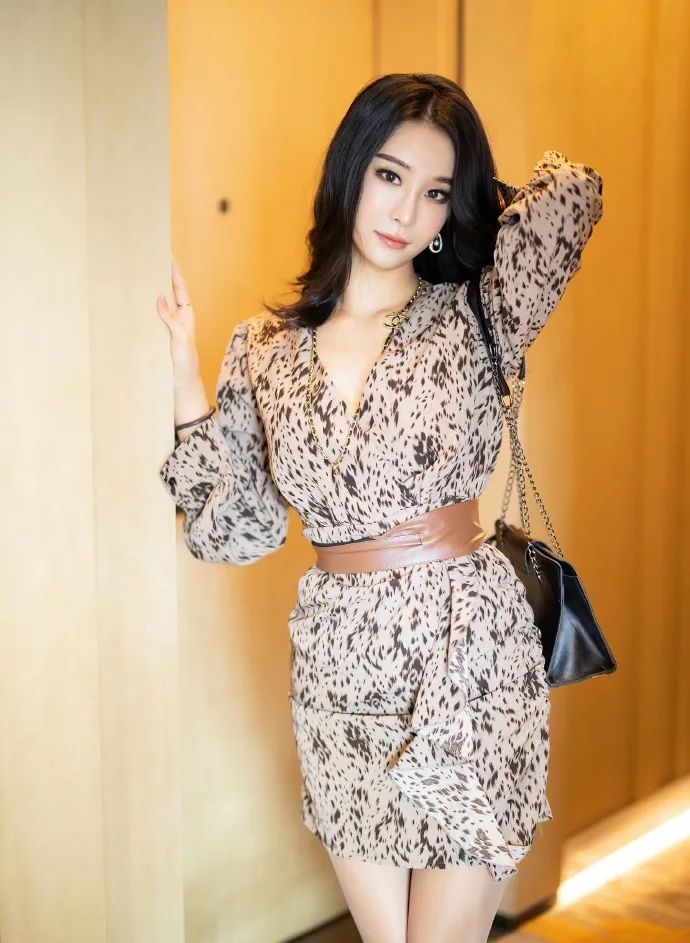 蓝夏的这组写真尽显野性优雅。她身穿一件豹纹连衣裙,裙摆的多层次与荷叶边装饰增添了几分柔美与灵动。棕色腰带与裙子完美融合,勾勒出曼妙身姿。黑色手提包简约大气,与整体造型相得益彰。黑色披肩长发自然垂落,尽显温婉气质。在木质墙面的映衬下,蓝夏的姿势优雅而自信,展现出独特的个人魅力。