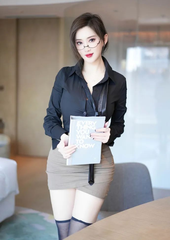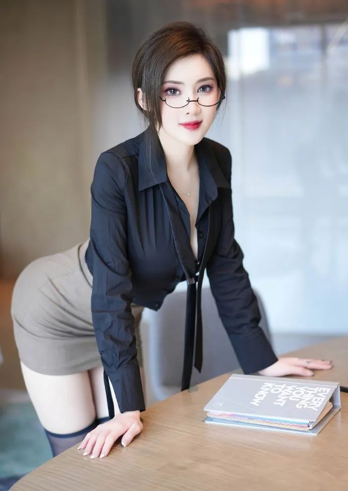 网红模特周妍希在这组写真照片中完美展现了时尚与职业的完美结合。她身着一件黑色衬衫,简约而不失高级感,搭配灰色短裙,既显得干练又不失女性的柔美。棕色的头发自然垂落,眼镜的加入更增添了一份知性气质。红唇轻点,妆容精致,彰显出她的自信与专业。站在室内环境中,她的姿势自信大方,一手轻抚桌面,一手执书静读,尽显时尚与职业的魅力。