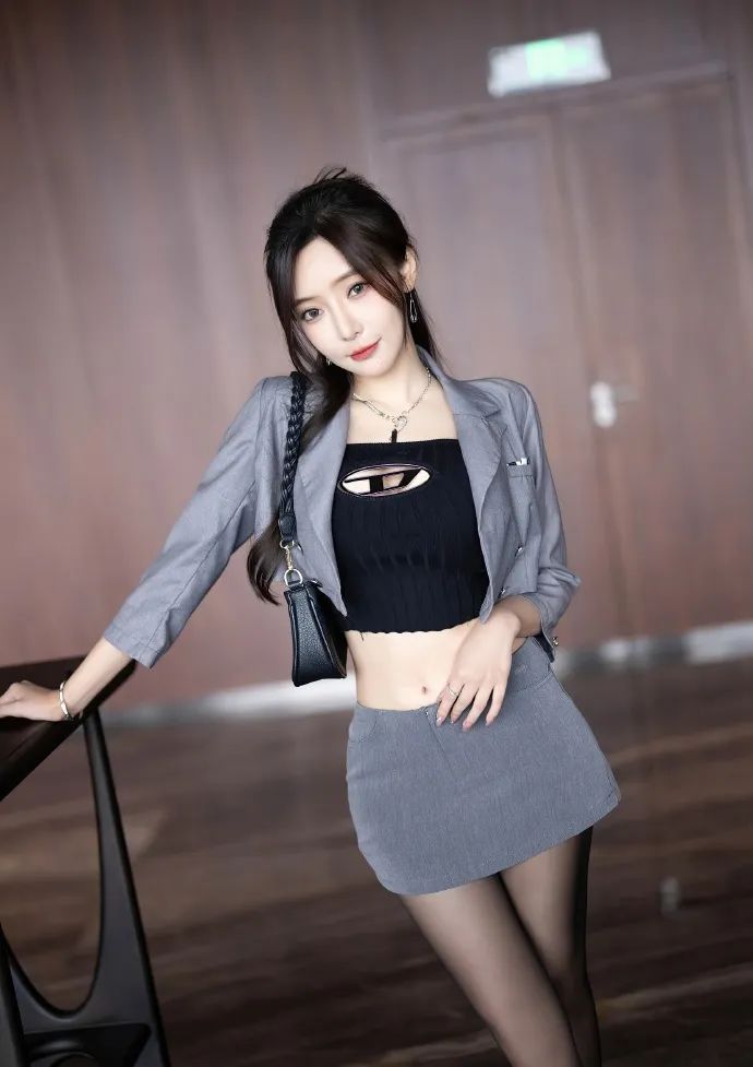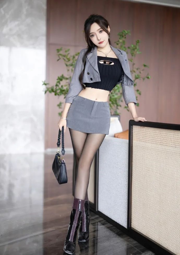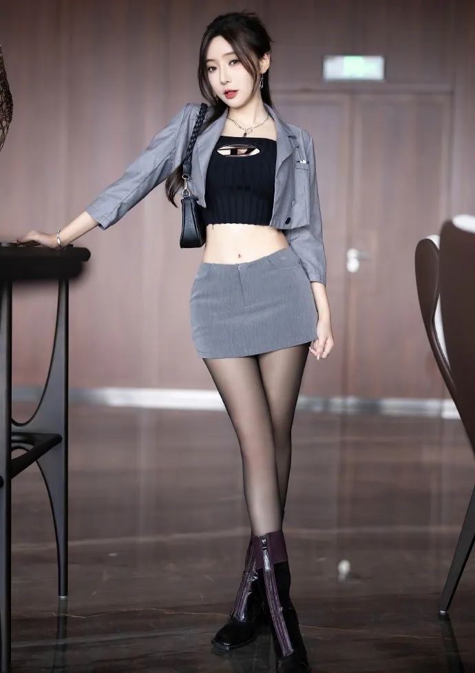 王馨瑶的这组写真穿搭彰显现代女性的优雅与时尚。她以灰色短裙搭配黑色紧身上衣,外披浅棕色夹克,层次分明又极具质感。黑色披肩长发搭配细小项链,更添柔美与精致。脚上的紫色高跟鞋,不仅拉长腿部线条,还增添了一抹亮色。