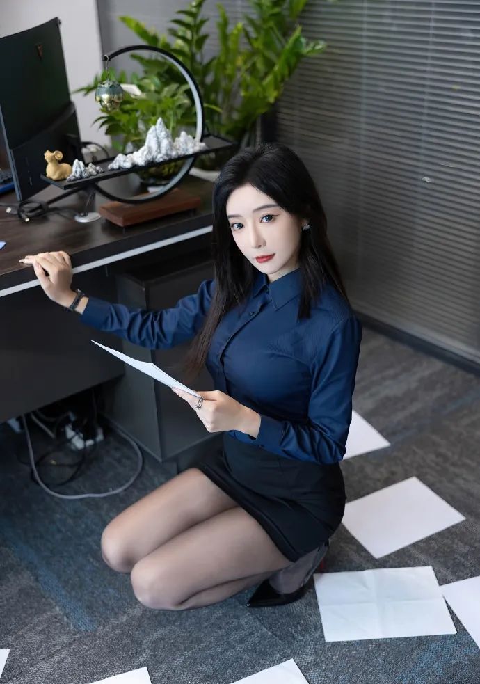 利世在这组写真中展现了她的商务风采。她身着一件蓝色衬衫,搭配黑色短裙和高跟鞋,整体造型简洁大方,透露出干练与优雅。棕色披肩长发自然垂落,增添了几分柔美与温婉。左手的文件和右手轻抚桌面的姿态,尽显她的专业与自信。这样的穿搭不仅适合办公室环境,还能让你在商务场合中脱颖而出,成为众人瞩目的焦点。