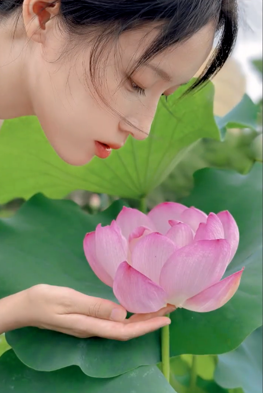 3. 利用荷叶做前景:选择一个舒适的姿势坐下,放低手机角度,让荷叶成为照片的前景,环绕在人物周围。这样的构图既能增加层次感与艺术感,还能让人物与荷花更加和谐地融为一体。