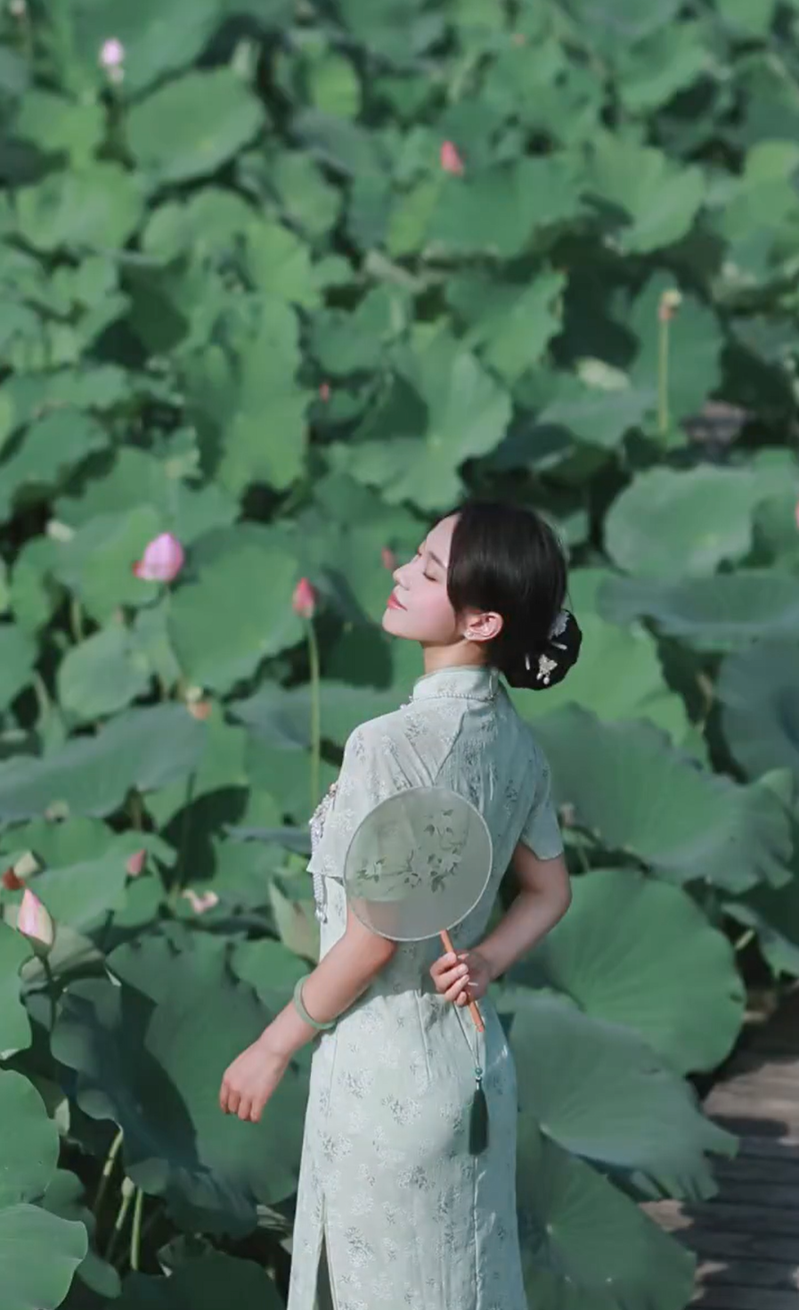道具:可以准备一些与荷花相关的道具,如扇子、伞等,为照片增添趣味元素。
