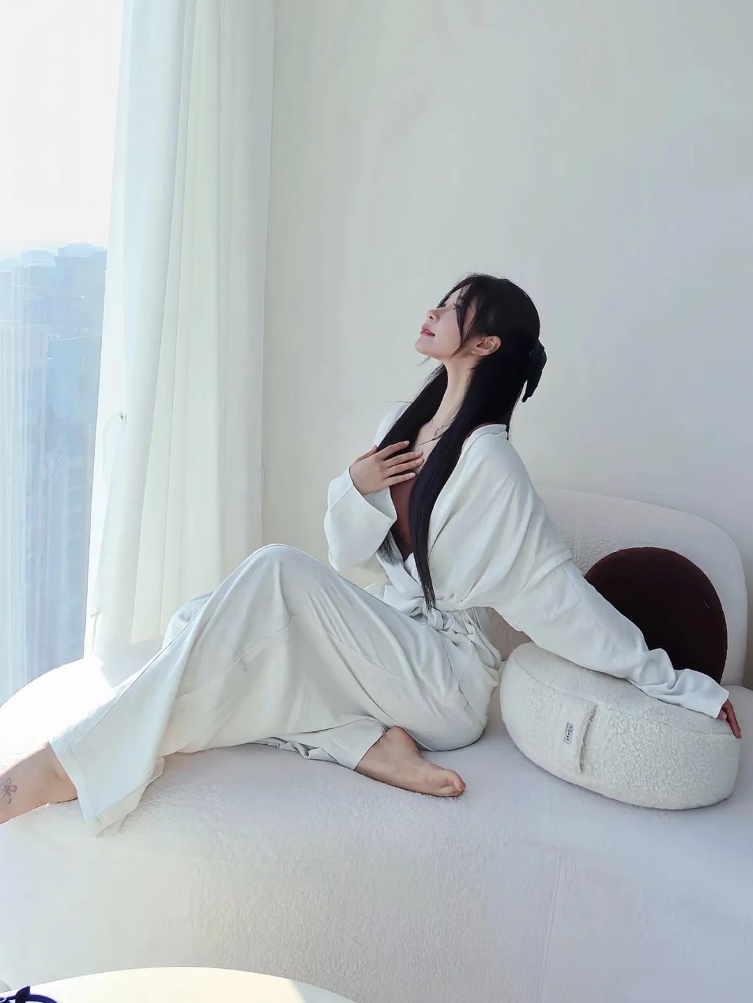 瑜伽是探索内在的旅程,是用身体去探险。贴身的瑜伽裤和运动内衣,与身体合一,让内在探索没有任何束缚,自由享受伸展和呼吸。白色的瑜伽裤非常洁白纯净,就像天空中的云朵,给人一种洒脱的感觉,搭配棕色运动内衣,整体非常简约时尚。