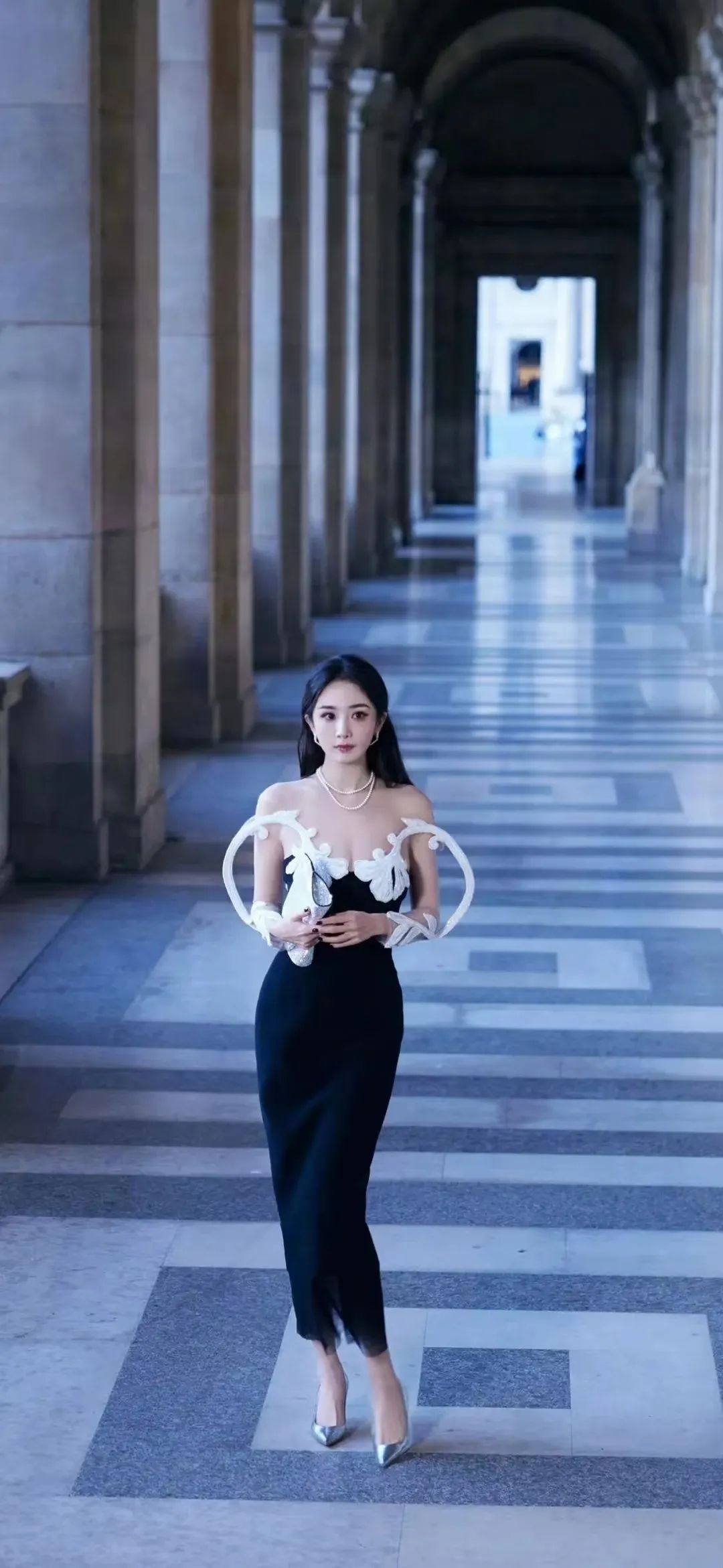 杨幂身着一袭黑色长裙,抹胸设计凸显出她优雅的气质与迷人的锁骨线条。裙身部分有银白色裙带的点缀,为整体造型增添了几分华丽。她手持银白色钱包和永生花,展现出时尚与艺术交织的独特韵味,魅力非凡。