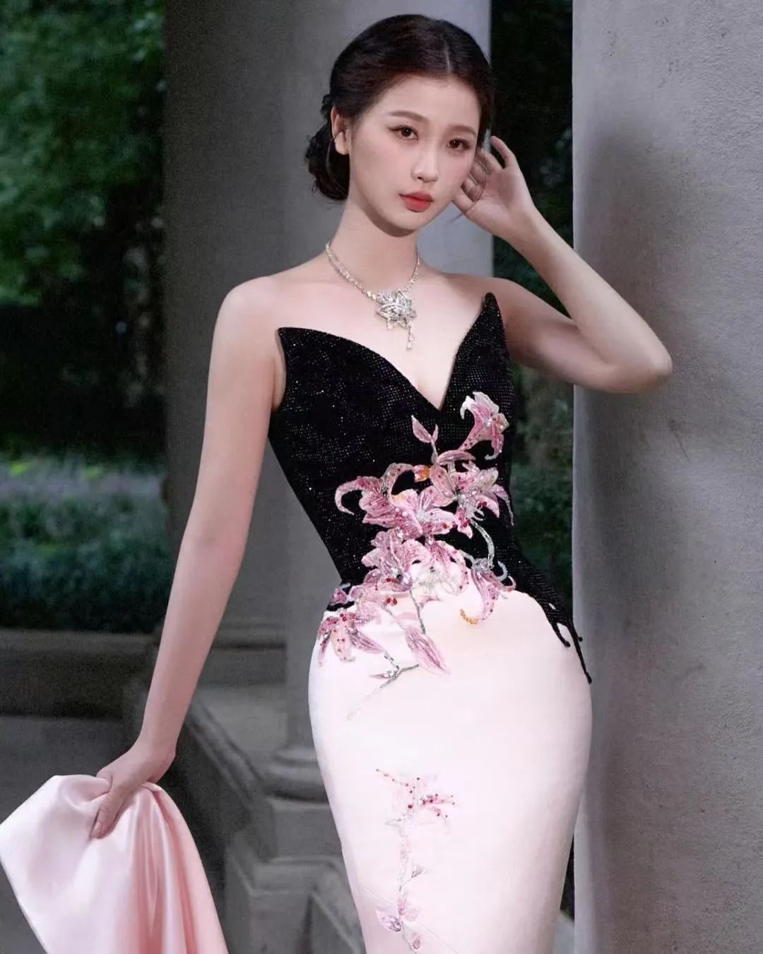 在这组写真中,虞书欣选择了一件黑色深V抹胸长裙作为她的战服。这件礼服采用了经典的黑色,上身部分点缀着闪耀的亮片,不仅增添了几分华丽的气息,也完美地凸显了她的身形。而裙摆则是柔和的粉色,与黑色的上半身形成了鲜明的对比,使得整体造型既高贵又不失甜美。