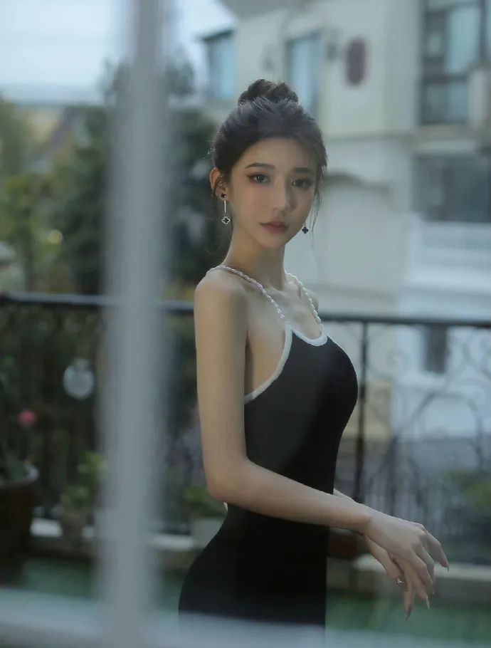这是网红模特黎允熙的一组优雅写真,她身着一袭黑色紧身连衣裙,完美勾勒出曼妙的身姿。盘起的头发搭配精致的耳环和项链,彰显出她的高贵气质。微微侧头看向窗外的姿态,更是增添了几分神秘感。脚下一双高跟鞋,虽然脚部没有完全进入画面,但足以想象她的优雅步伐。背景中的现代住宅和远处的风景,与她的穿搭相得益彰,构成了一幅完美的画面。这身穿搭优雅而不失时尚,尽显黎允熙的独特魅力。