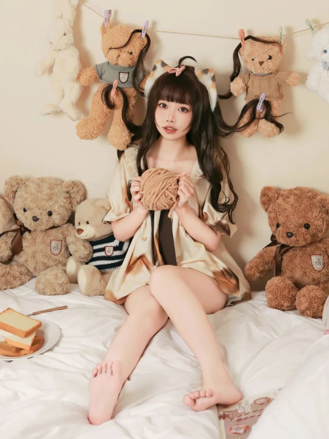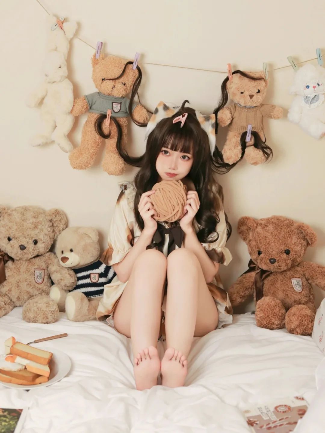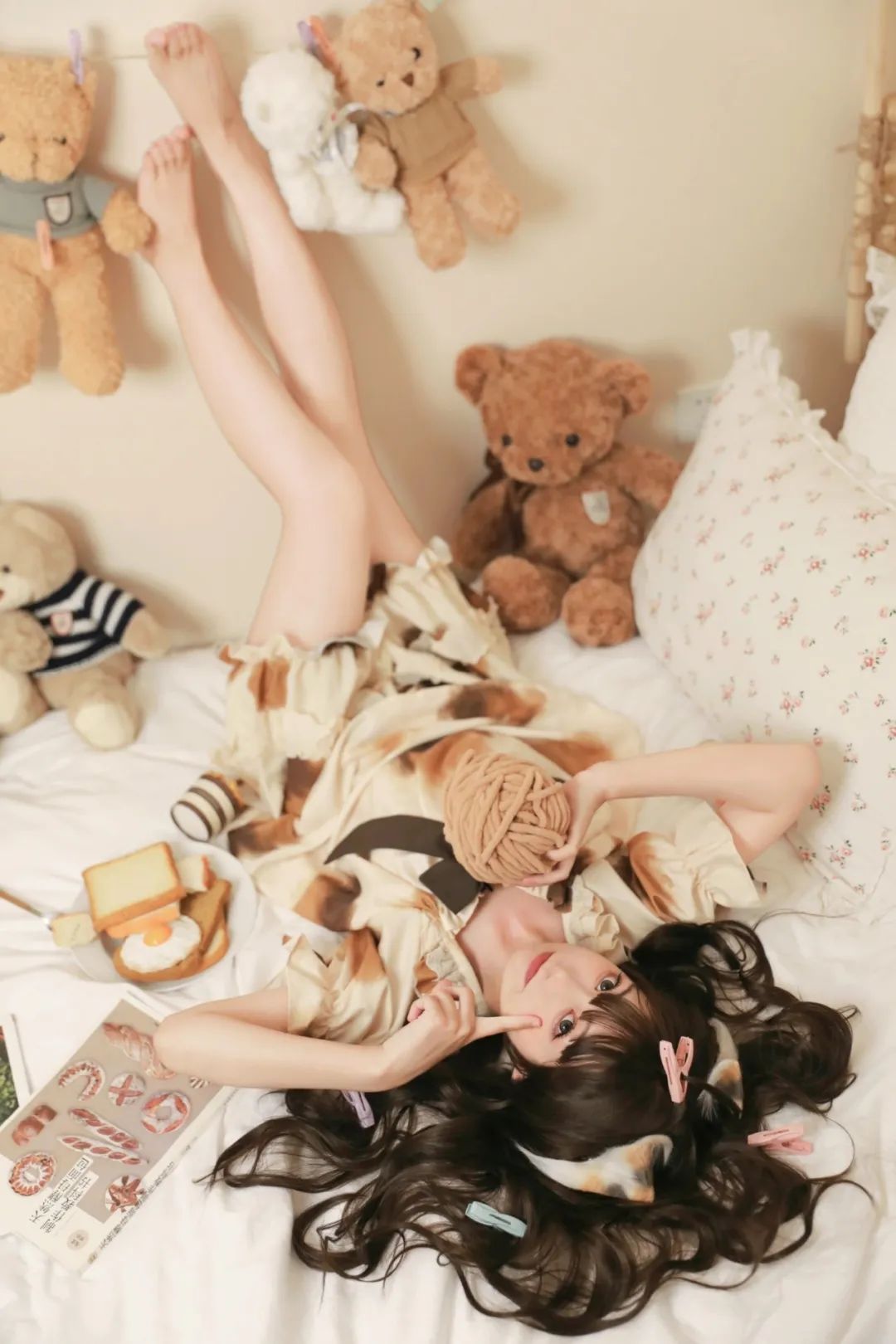 我静卧于床榻之上,怀中抱着蓬松柔软的毛线球,那温暖的触感仿佛拥抱着整个世界。四周,琳琅满目的泰迪熊玩具簇拥着我,它们憨态可掬的模样,宛如童年的守护者,默默地守护着这片纯真的天地。