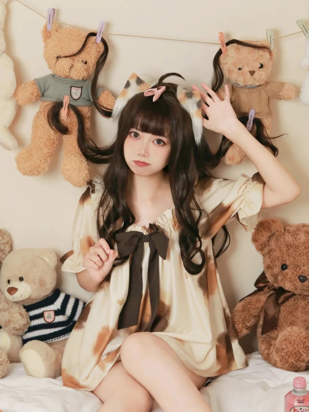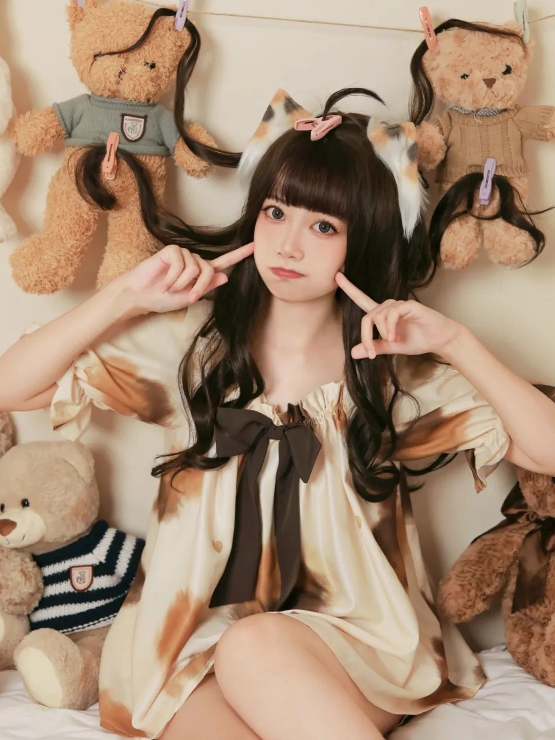 我身着一件棕色连衣裙,裙摆轻轻摇曳,仿佛时光的旋律在舞动。头顶戴着的猫耳朵发饰,俏皮可爱,它们轻轻颤动,似乎在倾听我内心的欢声笑语。此刻的我,宛如一个沉浸在童话世界中的小女孩,纯真无邪,无忧无虑。