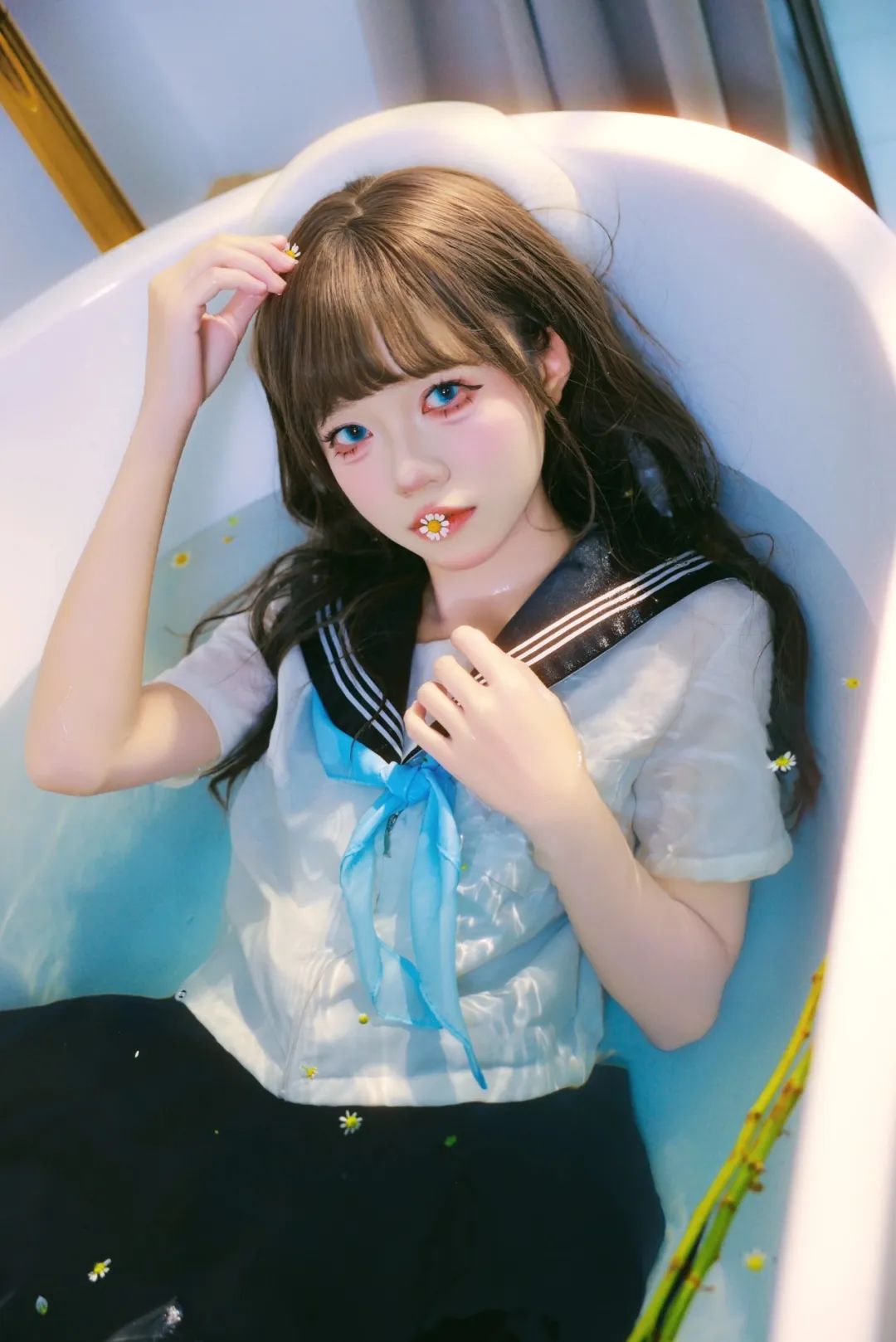 ?我沐浴在一个洋溢着宁静与梦幻的氛围之中。柔和的光线宛如金色的丝带,轻轻地洒落在波光粼粼的水面上,营造出一种温暖而祥和的意境??️。我身着整洁的水手服,手中捧着一束鲜艳的鲜花,仿佛在与这个世界进行一场无声的交流??。