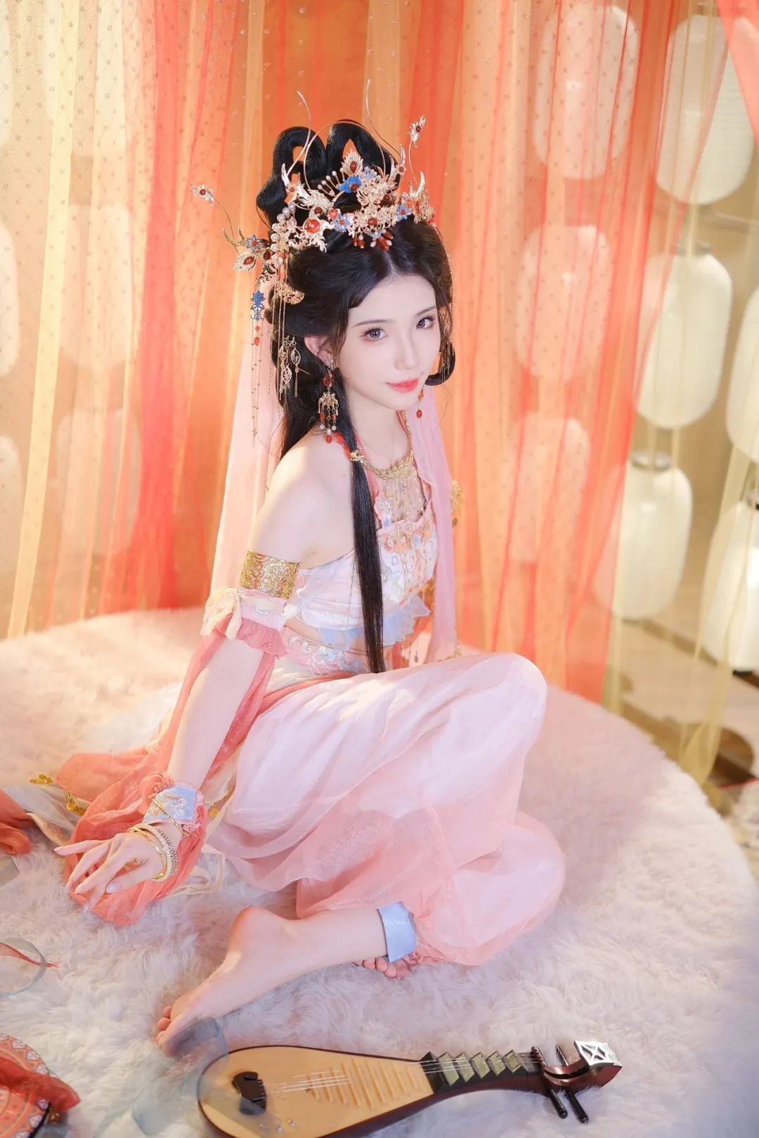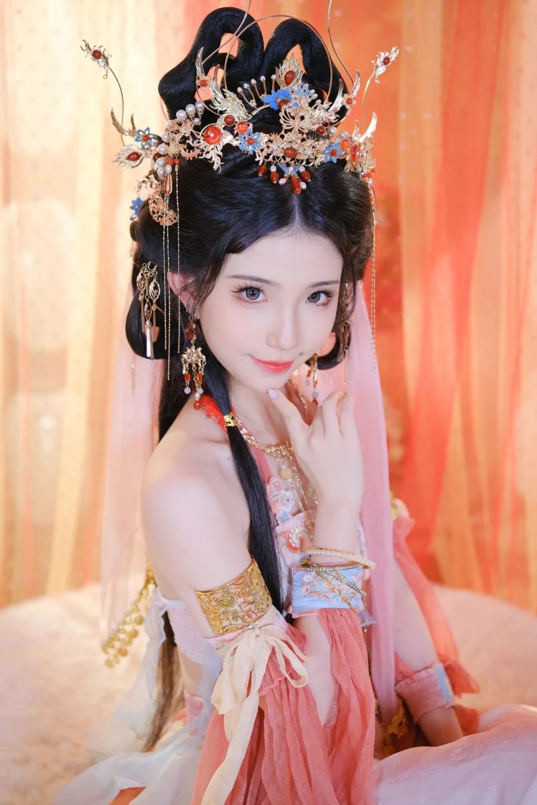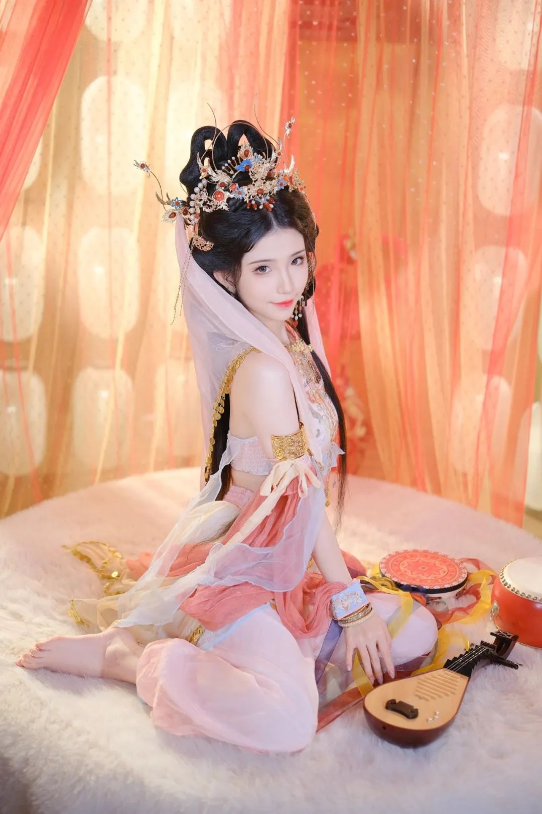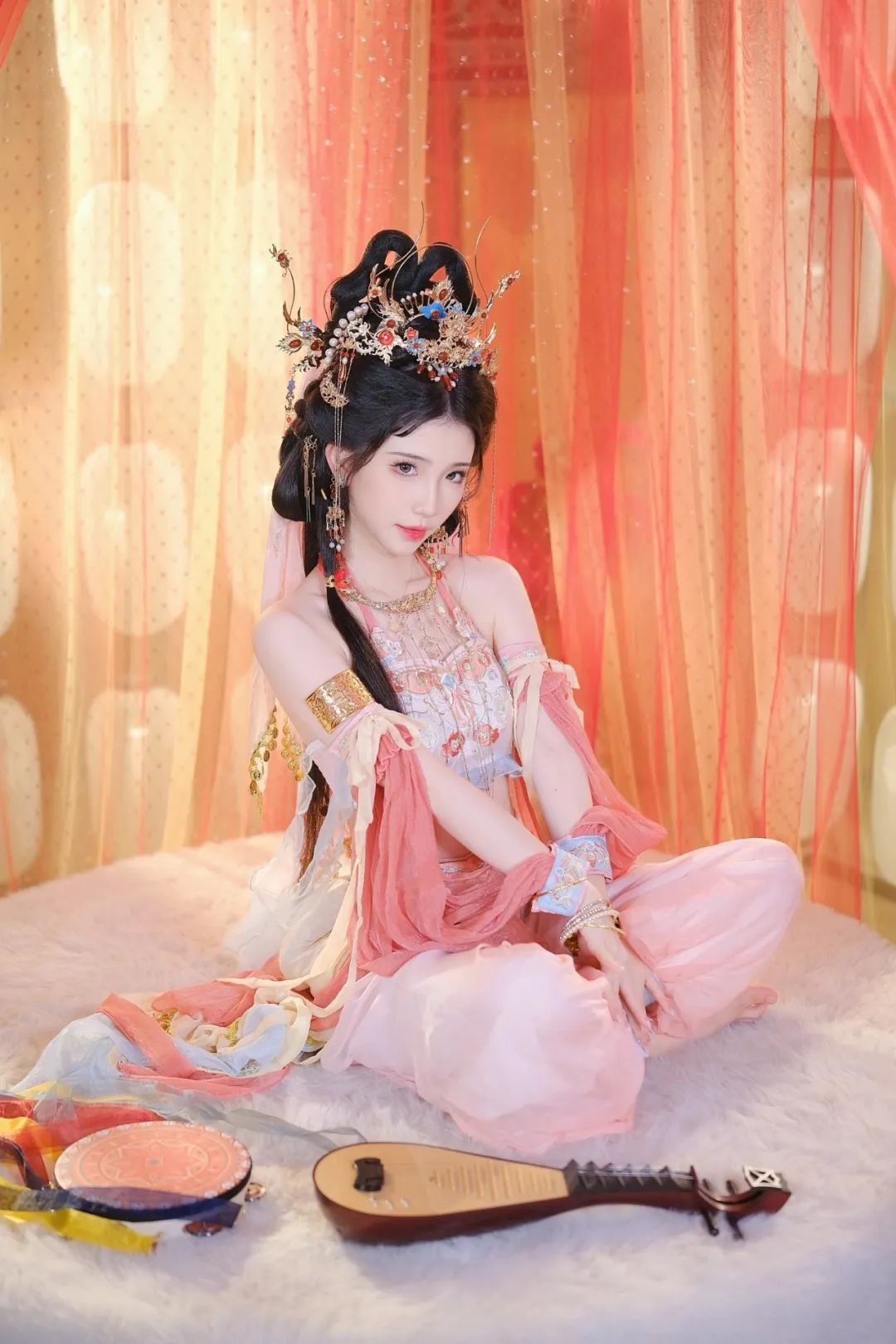 我身着一袭粉色的汉服,优雅地盘膝坐在柔软的毛绒地毯上。头顶上,一顶华丽的金色发冠熠熠生辉,其上精心镶嵌着各式宝石与珍珠,彰显出无与伦比的高贵与典雅。我的耳边,垂着一对修长的流苏耳环,它们随着我的每一个细微动作轻盈摇曳,仿佛在诉说着古老的故事。