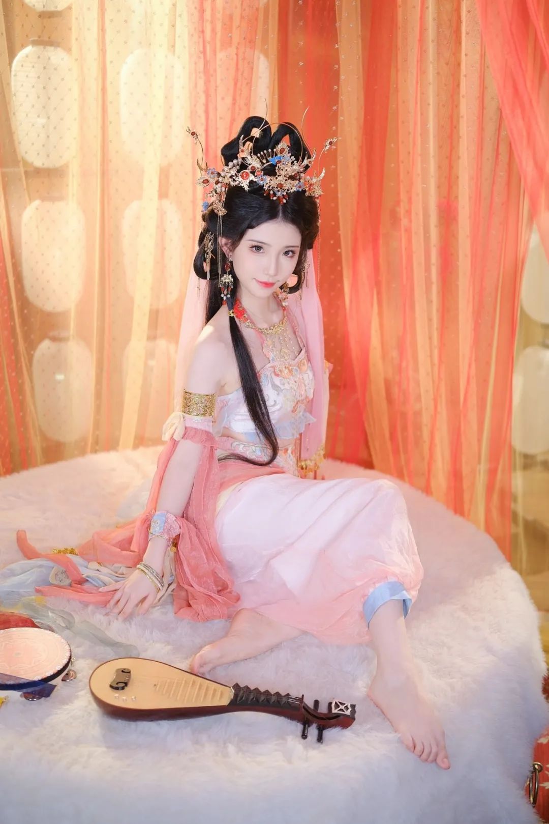 此刻的我,仿佛是从古代画卷中走出的仙子,将古代的优雅与现代的气息完美融合。我的存在,不仅是一种美的展现,更是一种文化的传承与发扬。在这片橙黄色纱幔的映衬下,我与古琴、流苏耳环、金色发冠共同构成了一幅动人的画面,让人仿佛置身于一个充满韵味的古代世界。