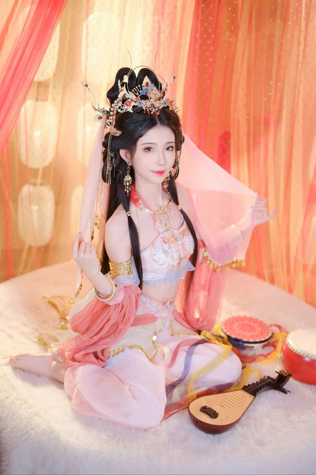 背景中,橙黄色的纱幔轻轻飘动,如梦似幻,它那温暖的色调与神秘的质感相互交织,营造出一种既温馨又神秘的氛围。这纱幔仿佛是一道通往古代的时光之门,引领着人们进入一个充满诗意与遐想的世界。